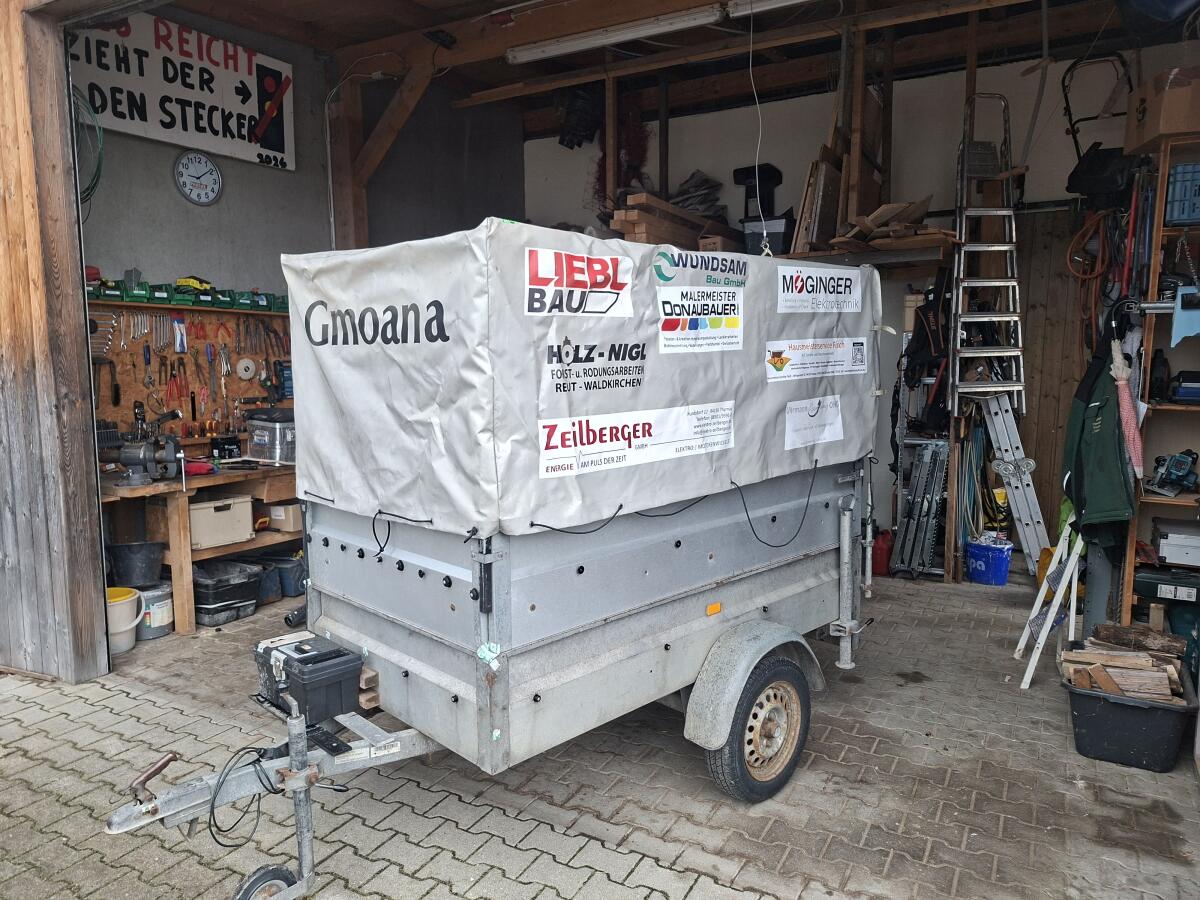 Stema 750 kg Anhänger mit vielen Zurrösen, da der Anhänger hauptsächlich für die Fischerjugend verwendet wurde. Hinten li., re. Stützfüße, Bodenplatte neu, Gurtkoffe
