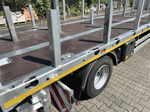 Fahrgestell: Feuerverzinkt, Holz Boden 70 mm stark, 18 x Zurrösen, 12 x Rungentaschen, 2 x Rampen je 3.110 mm lang x 760 mm breit, hydraulische 1 teilige Rampen