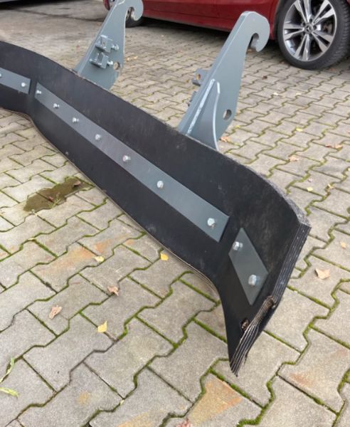 Der Gummischieber wurde nur wenige Wochen genutzt, da der Kunde auf Modell mit Stahldrahteinlagen umgestiegen ist. • Gummileiste (400x25mm) mit Gewebeeinlage (optimal im Bereich der Tierfütterung) • Ohne Schwenkung [W10] • Links und rechts 300mm je 35° nach vorn abgewinkelt • 120 kg Eigengewicht • Arbeitsbreite 2300 mm Zusatzausstattung 1 Rad- oder Teleskoplader Werkzeugaufnahme (Kramer universal)