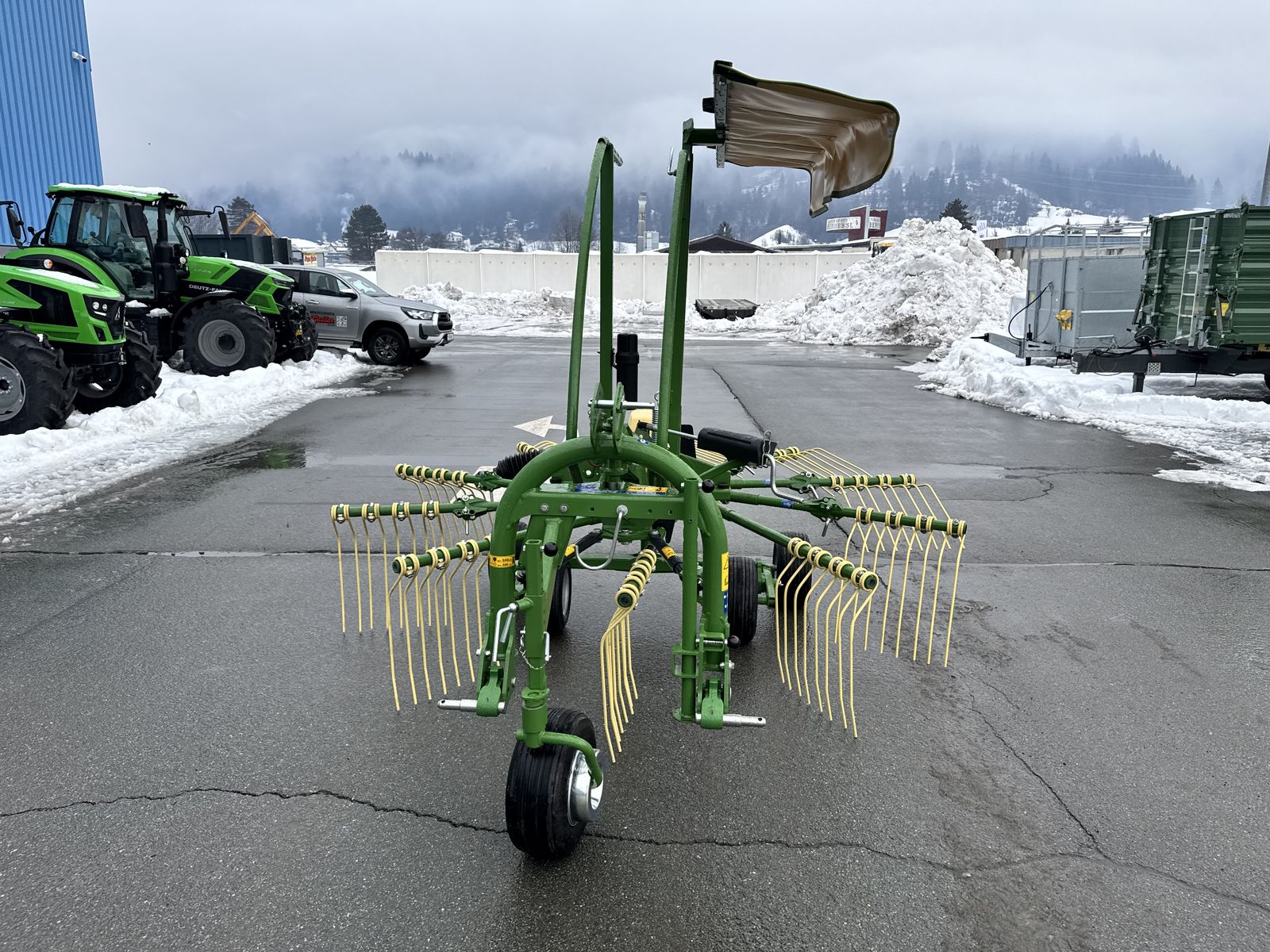 Krone Swadro S 380 Einkreiselschwader. Neumaschine in folgender Ausführung: * Arbeitsbreite 3800 mm * Transportbreite ca. 1850mm * Eigengewicht ca. 530 kg (Grundausstattung) * Kreiseldurchmesser 2960 mm * Zehn Zinkenarme, davon fünf klappbare Zinkenarme * Vier Doppelzinken 10 mm pro Arm mit großem Windungsdurchmesser und „Lift-Effekt“ * Dreipunktanbau Kat. II (montierbar in 2 Positionen-näher am Traktor) * Dämpferstreben mit innenliegenden Druckfedern * Selbstzentrierung des Schwaders beim Ausheben * Nachlaufeinrichtung des Anbaubockes für Kurvenfahrt von bis zu 20° * Kreiselgetriebe mit wartungsfreier Fließfettfüllung * komplett durchgehärtete KRONE Dura-Max Kurvenbahn * Manuelle, stufenlose Einstellung der Kreiselarbeitstiefe inkl. Kreiselhöhenanzeige mit Skala * Tandemkreiselfahrwerk mit Ballonbereifung 16x6.50-8 * Gelenkwelle mit Überlastkupplung * Vorderes Tastrad * teleskopierbares, stufenlos einstellbares und nach oben Schwenkbares Schwadtuch * mittige Warntafeln Andere Modelle auf Anfrage. Wir freuen uns auf Ihre Anfrage!