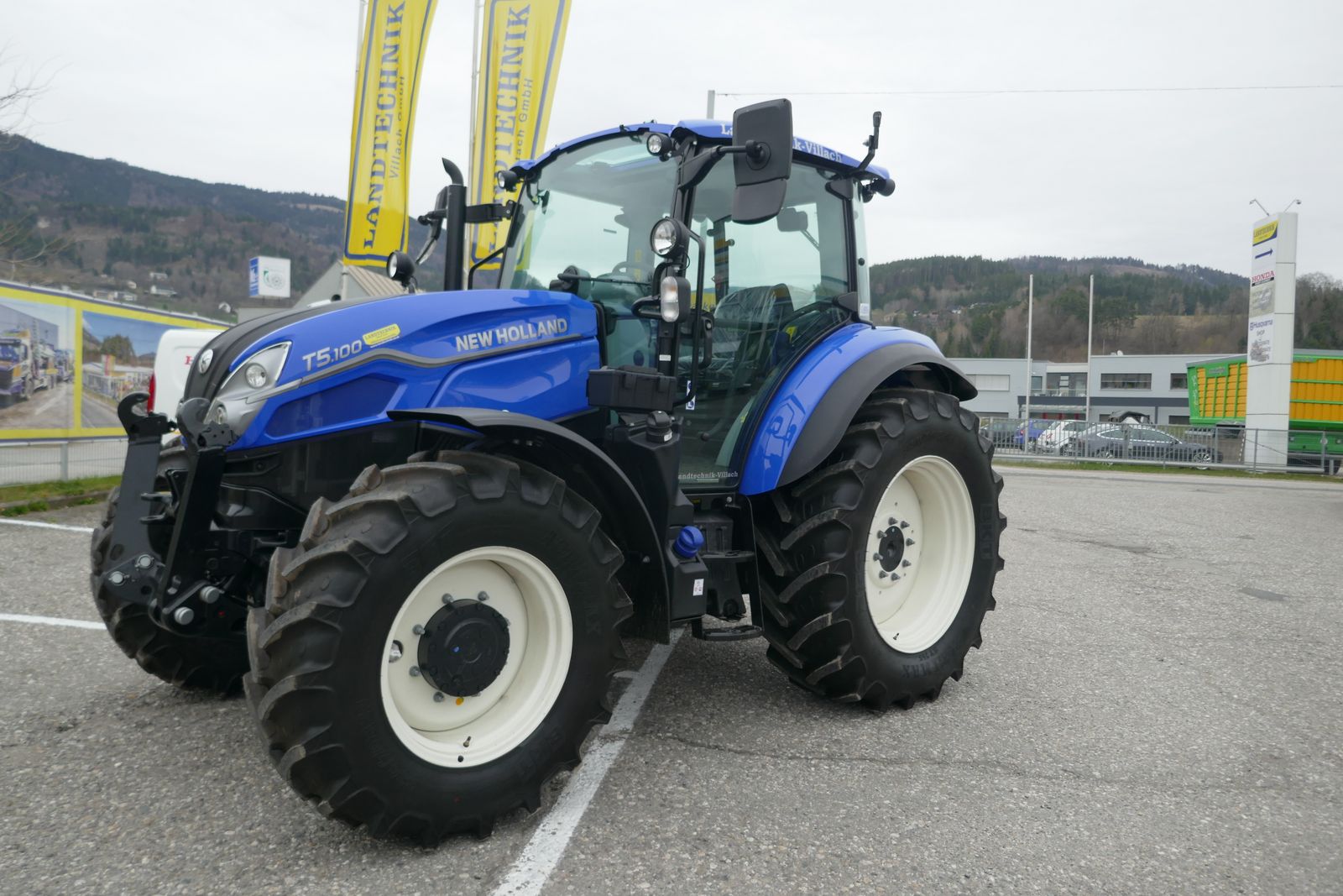 New Holland T5.100 DC, mit starker 1,5 Vorderachse, 4-Zylinder und 4 Ventiltechnik, 24x24 Powershuttlegetriebe mit Stop & Go Funktion und mit Lastschaltung 40 km/h, mechanische Parksperre, Hydraulik Hubkraft 4,7 t, 80 L Hydraulikpumpen Leistung, 3x DW Steuergeräte hinten, hydraulisches Bremsventil, EHR mit Außenbetätigung, integrierte Fronthydraulik, Komfortkabine, mit Lichtpaket, ergonomisch mit Klima, Dachfenster, Beifahrersitz, Luftsitz, verstellbare Lenksäule, neues digitales Armaturenbrett, Radio, Bereifung: 480/65-34 und 380/65-24, automatische Scharmüller Anhänge Vorrichtung, mit Tankschutz, ohne Ackerschiene, prompt verfügbar.