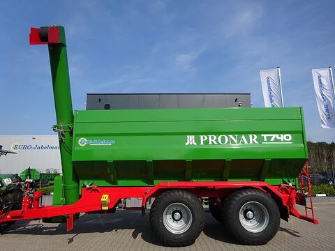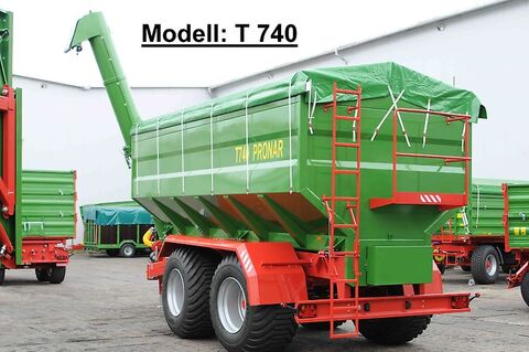 NEUMASCHINE: Pronar Überladewagen mit Tandem- oder Tridemachsen, verschiedene Ausführungen - Modell T 743 Tridem: Mehr Leistung für Ernte und Aussaat, sehr hohe Schlagkraft durch superschnelle Überladung, Entleerungsleistung ca. 450 t/h = ca. 4 min, für alle körnigen Güter wie Getreide, Dünger, Mais usw., 3 Sichtfenster, spezielle Zuführschnecke mit gewuchteten Windungen, vollhydraulische Bedienung für Entleerungsrohr, 2-Kreis-Druckluftanlage mit 40 km/h-Ausführung, Tridem-Fahrwerk mit 1. und 3. Nachlaufachse und hydr. Sperrung, Abstellstütze mit Winde, Metallkotflügel, klappbare Aufstiegsleiter. Eigengewicht ca. 10.300 kg, Ladevolumen ca. 34 m³, Behälterlänge ca. 7265 mm, Behälterbreite ca. 2490 mm, Behälterhöhe ca. 2570 mm , Gesamthöhe ca. 3700 mm, Überladehöhe ca. 4700 mm, Zul. Gesamtgewicht ca. 33.000 kg, Nutzlast ca. 22.700 kg, Bereifung 700/50-26,5. - Modell T 740 Tandem: Mehr Leistung für Ernte und Aussaat, sehr hohe Schlagkraft durch superschnelle Überladung, Entleerungsleistung ca. 450 t/h = ca. 3 min, für alle körnigen Güter wie Getreide, Dünger, Mais usw. spezielle Zuführschnecke mit gewuchteten Windungen, vollhydraulische Bedienung für Entleerungsrohr, 2-Kreis-Druckluftanlage mit 40 km/h-Ausführung, ADR-Tandem-Fahrwerk mit Nachlaufachse und hydr. Sperrung, Abstellstütze mit Winde, Technische Daten: Fassungsvermögen ca. 28 m³, Behältermaße L/B/H: 6040/2530/2570 mm, Gesamthöhe ca. 3700 mm, Überladehöhe ca. 4700 mm, Zulässiges Gesamtgewicht ca. 23.000 kg, Nutzlast ca. 16.000 kg, Leergewicht ca. 7.000 kg, Bereifung: 710/45-26.5. Das komplette Programm mit allen Zusatzausrüstungen und Zubehör sowie Preise finden Sie bei uns im Web unter www euro-jabelmann de. Dann Anhänger / Fahrzeuge. Anlieferung und Finanzierung gegen Mehrpreis möglich. EURO-Jabelmann liefert 2000. PRONAR-Fahrzeug aus. Seit dem Jahre 2007 vertreibt EURO-Jabelmann als Importeur für Deutschland Fahrzeuge und Anhänger der Firma PRONAR aus Polen. In Verbindung mit der Tarmstedter Ausstellung 2015 hat EURO-Jabelmann nun das 2000. PRONAR-Fahrzeug, einen PRONAR-Ballenwagen mit Portaltüren zur Ladungssicherung, an den Lohnunternehmer Michael Piening aus Adelheidsdorf bei Celle geliefert. Im Fuhrpark von Herrn Piening befinden sich neben weiteren PRONAR-Fahrzeugen bereits sechs von EURO-Jabelmann gelieferte PRONAR-Ballenwagen.Der ausgelieferte Ballenwagen ist mit einer Ladungssicherung, bestehend aus seitlich zu öffnenden Portaltüren, versehen. Diese Ladungssicherung (auch als Nachrüstsatz) wird bei EURO-Jabelmann in Itterbeck hergestellt und montiert. Der Rahmen ist komplett mit einer Pulverbeschichtung versehen.
