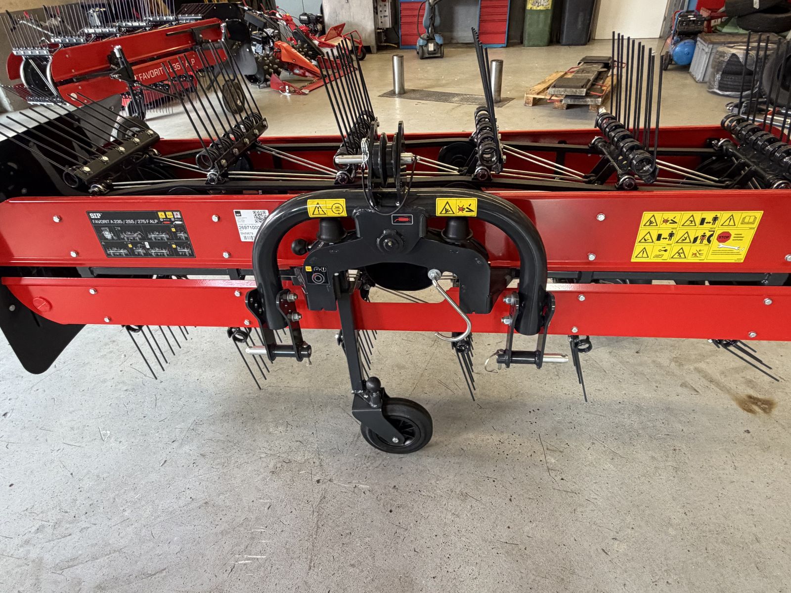 Arbeitsbreite 250 cm Außenbreite 295 cm Eigengewicht 344 kg 5 Zinken pro Reihe (5-reihig) Zapfwellendrehzahl wahlweise 540 oder 1000 U/min (beide Riemenscheiben mit Riemen dabei) gedämpfter Pendel-Anbaubock verstellbare Unterlenkerzapfen Bereifung 15x6.00-6 mechanisch verstellbares Schwadtuch Gelenkwelle