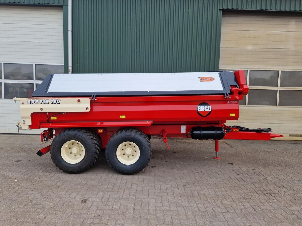 == Overige details (NL) == Beco brevis 100 met afdekluiken • 10 ton laadvermogen • Laadbak 4100 x 2050 x 500mm binnenwerks • Voorzien van hydraulische afdekluiken • Hoogte bak vanaf de grond gemeten 1600 mm • Laadcapaciteit 4200l (waterinhoud) • Laadcapaciteit 6600l (met kop) • Bodem 6 mm / Slijtvast staal (400HB) • Zijwanden 4 mm / Hoogsterkte staal (S.700) • Pendeltandem aslichaam 90x90x8 • Dissel in hoogte verstelbaar • Luchtgeremd met handbediende 3 standen remkrachtregelaar • Enkelwerkende hydraulische steunpoot bedienbaar vanaf trekker • Hydraulische achterklep in combinatie met deuren en U profiel voor oprijplanken • Banden BKT 500/50x17 693 ridemax hoogte 932 mm breedte 503 mm • Onderrijbumper • Draaibaar trekoog of K80 koppeling • Ledverlichting Staat: Nieuw Bouwjaar: 2023