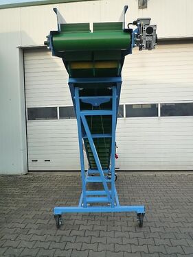 NEUMASCHINE; Eigene Herstellung, Rahmen pulverbeschichtet (Einbrennlackierug) bei uns in Itterbeck gebaut: EURO-Jabelmann Förderband / Zubringeband V 4000/650 K, Für Sortierer, Kisten, Bunker, Big-Bags, Anhänger etc., Fahrgestell mit Räder, Höhenverstellung über Winde, Antriebsmotor 0,75 kW/400 Volt, gummierter Einlauftrichter ca. 1150 mm breit, Bandlänge schräg ca. 4000 mm, Bandlänge gerade oben ca. 700 mm, Bandbreite ca. 650 mm, Stollenbreite ca. 570 mm, Stollenhöhe ca. 60 mm, Stollenabstand ca. 250 mm, Bendgeschwindigkeit ca. 16 m/min. Überladehöhe 2100 – 3115 mm, Leistung ca. 20 to/Std. Mehrpreise: Stufenlose Geschwindigkeitsverstellung über Frequenzregler mit 10 m Kabel und Fernbedienung EUR 995,-- alle Preise zzgl. Mwst. Eigene Herstellung, daher Bau in Länge und Breite auch nach Wunsch möglich. Pulverbeschichtet (Einbrennlackierung). Anlieferung gegen Mehrpreis möglich.