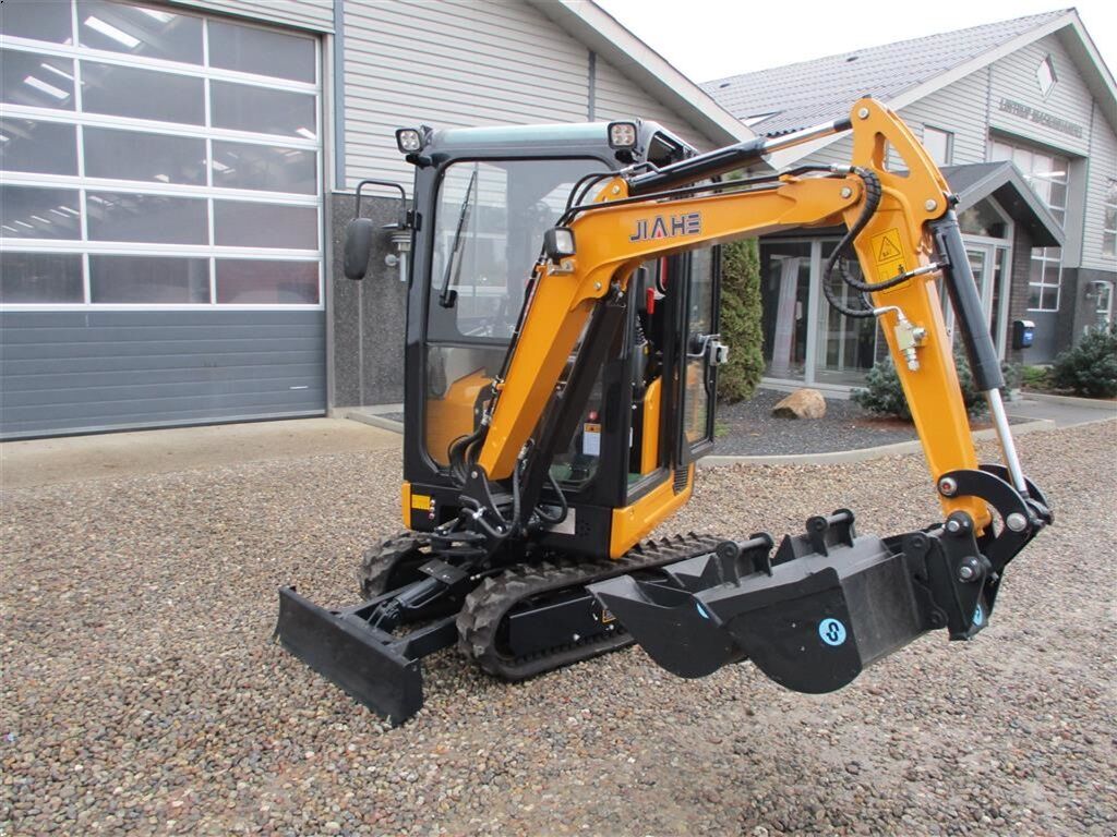 JIAHE JH18 minigraver med original Kubota diesel motor. Den har hydraulisk udskydelig undervogn på og sving på gravearmen og doserblad. Der er monteret et Dansk CP-metal hurtiskifte på den med med S30-150 skifte. Skovlpakken som er med følgende er også fra CP-Metal og er er en 20cm