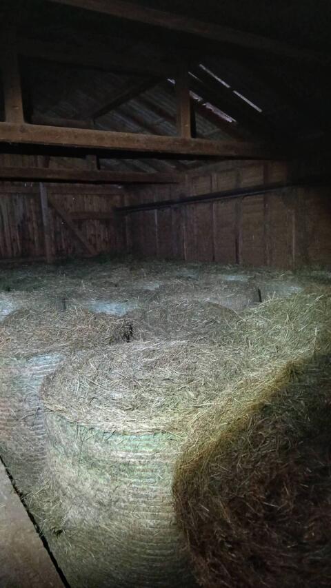 Rund 30 Stk., 140 cm Dm. Heuballen, 1. Schnitt, gepresst und in die Halle gebracht am 13.06.25 nach 4 Tagen Sonne mit Wind, auf Paletten gelagert zur Unterlüftung. B