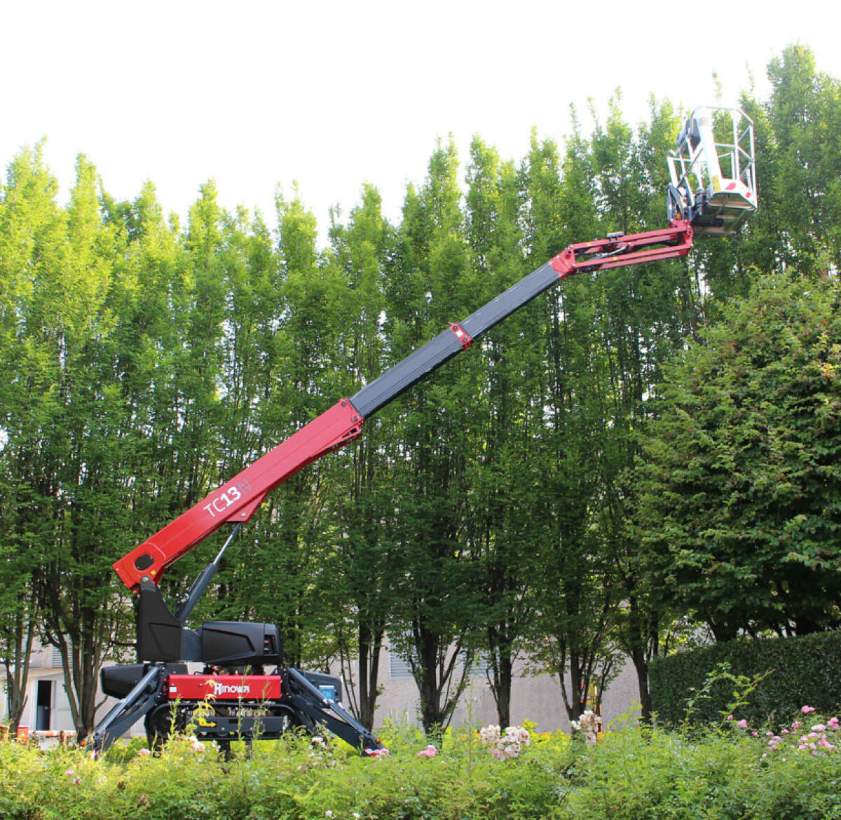 Teleskop-Raupenbühne Hinowa TeleCrawler13S, el./Akkubetrieben, automatische Abstützung, Arbeitshöhe 13 m, geringe Abmessungen und eine Abstützfläche von nur 2,8 m x 3,1 m. Korblast 230 kg, maximale Höhe 13 m, max. waagrechte Reichweite der Arbeit 6,40 m, Gesamtgewicht 2.050 kg, nicht markierende Gummiketten.