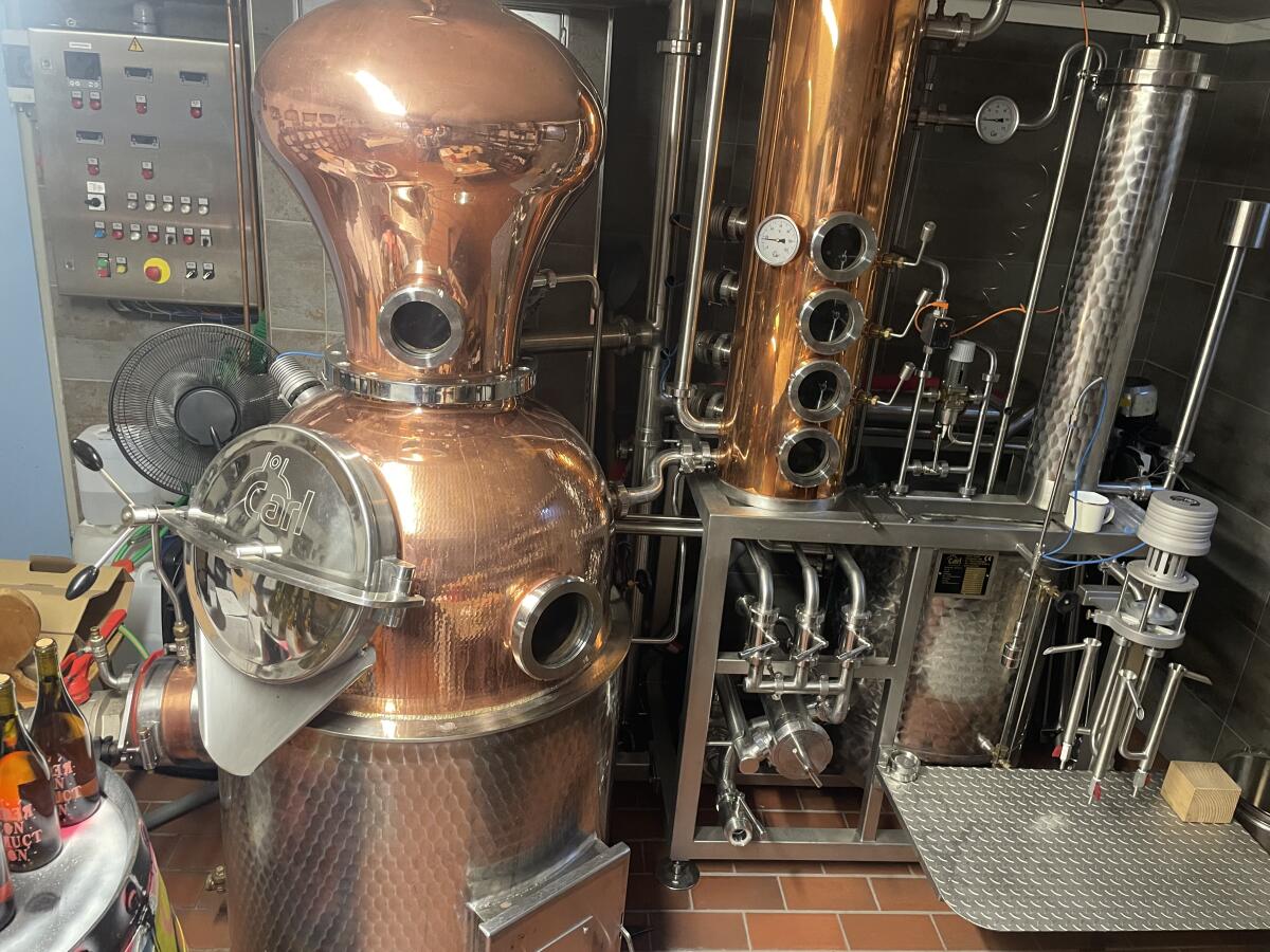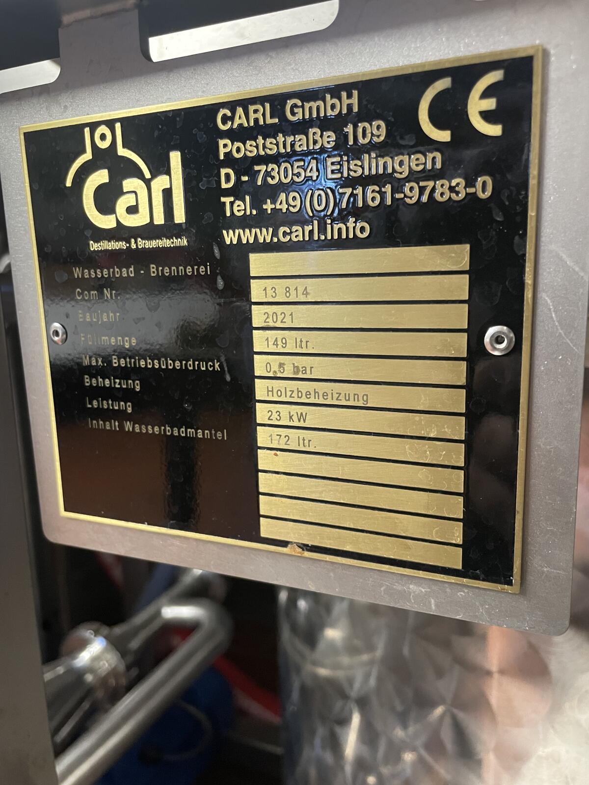 CARL, neuwertige Wasserbad-Brennerei mit Feinbrenner-Kolonne. Daten: Bj. 2021, Blaseninhalt: 149 l, Inh. (Dampf-Wasserraum): 172 l, Holzbeheizung, Temperatursteuerung, inkl. Beleuchtung, Selbstabbau.