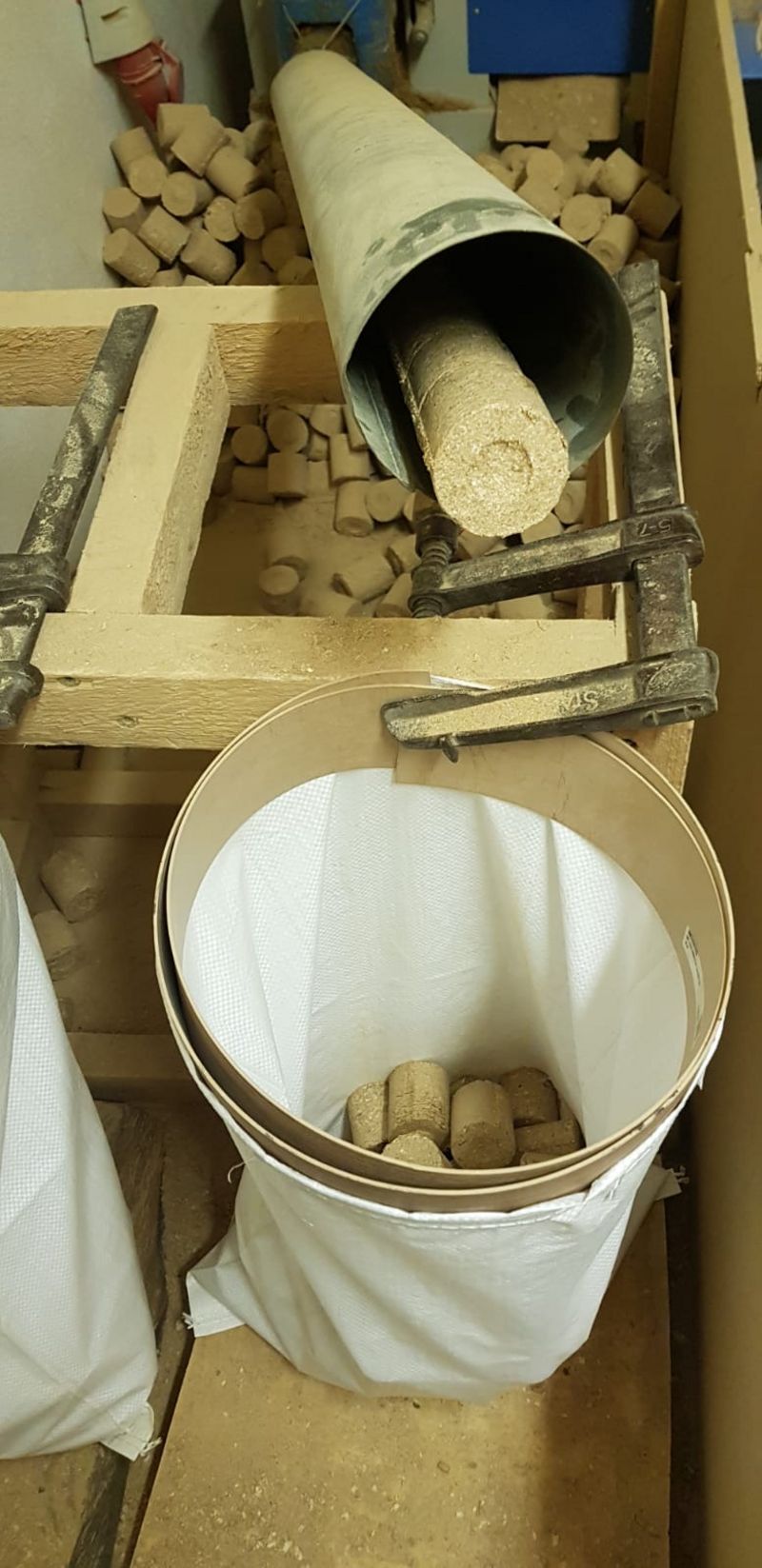 Holzbriketts aus Lärche und Eiche ohne Bindemittel, 1 t sind 50 Säcke zu je 20 kg.