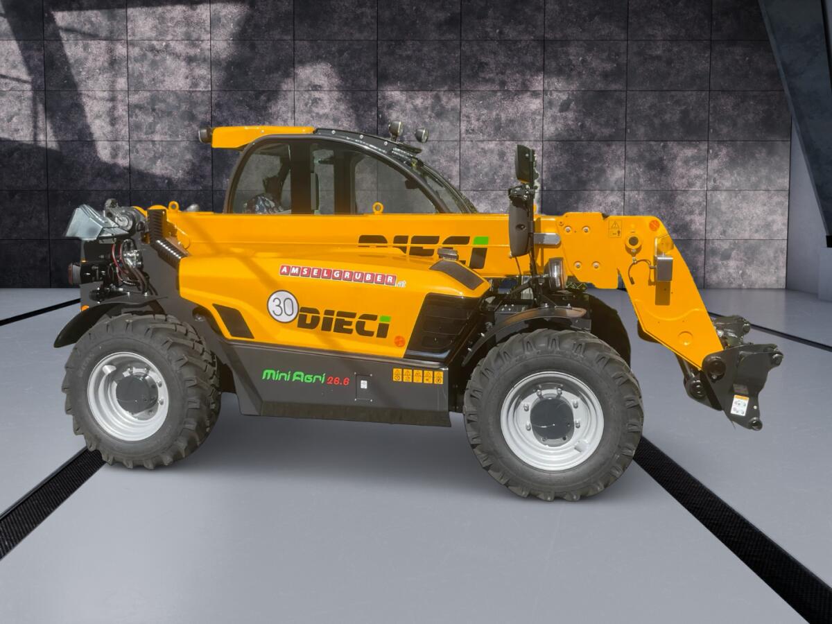 DIECI 26.6 Mini Agri mit Österreichpaket (TOP-Ausstattung), 2.600 kg Traglast, unter 200 cm Bauhöhe, 75 PS, 4 Zylinder, 3.300 ccm, 30 km/h, 80 l/min Hydraulikleistung, StVo Beleuchtung, 4-in-1 Joystick mit Flow-Sharing & Proportionalsteuerung (Alle Funktionen auf Joystick, mehrere Funktionen gleichzeitig und proportional möglich), luftgefederter Fahrersitz, Euroaufnahme mit hydr., 3.+4. Steuerkreis, 4 Hydraulikanschlüsse vorne (2xDW vorne - Funktion konstanter Ölfluss, Druckentlastungsschalter für Hydraulikanschlüsse, 2 Stk. Arbeitsscheinwerfer vorne und hinten, 1x LED Scheinwerfer auf Teleskoparm, Rundumkennleuchte, Bereifung 12.0/75-18, LED Tagfahrlicht, 3 Lenkungsarten neu. Preis VB € 74.999,-.