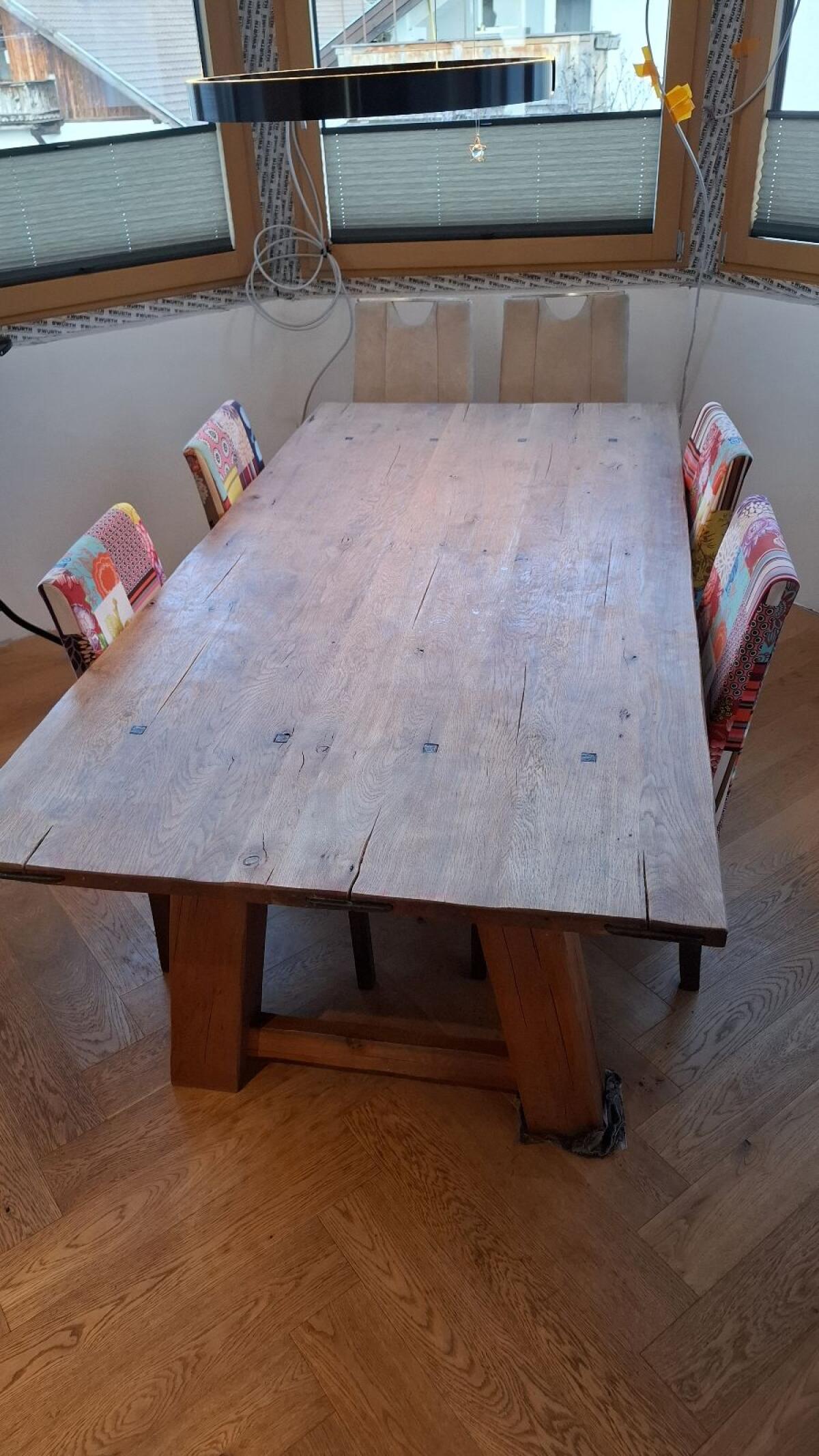 Esstisch Eiche Vollholz rustikal, sehr massiv, Maße 2 m x 1 m, dicke Platte 3 cm, eingearbeitete Eisenelemente, gekauft bei XXXLutz NP € 1.200,-. Stühle können gratis dazugegeben werden, Selbstabholung.