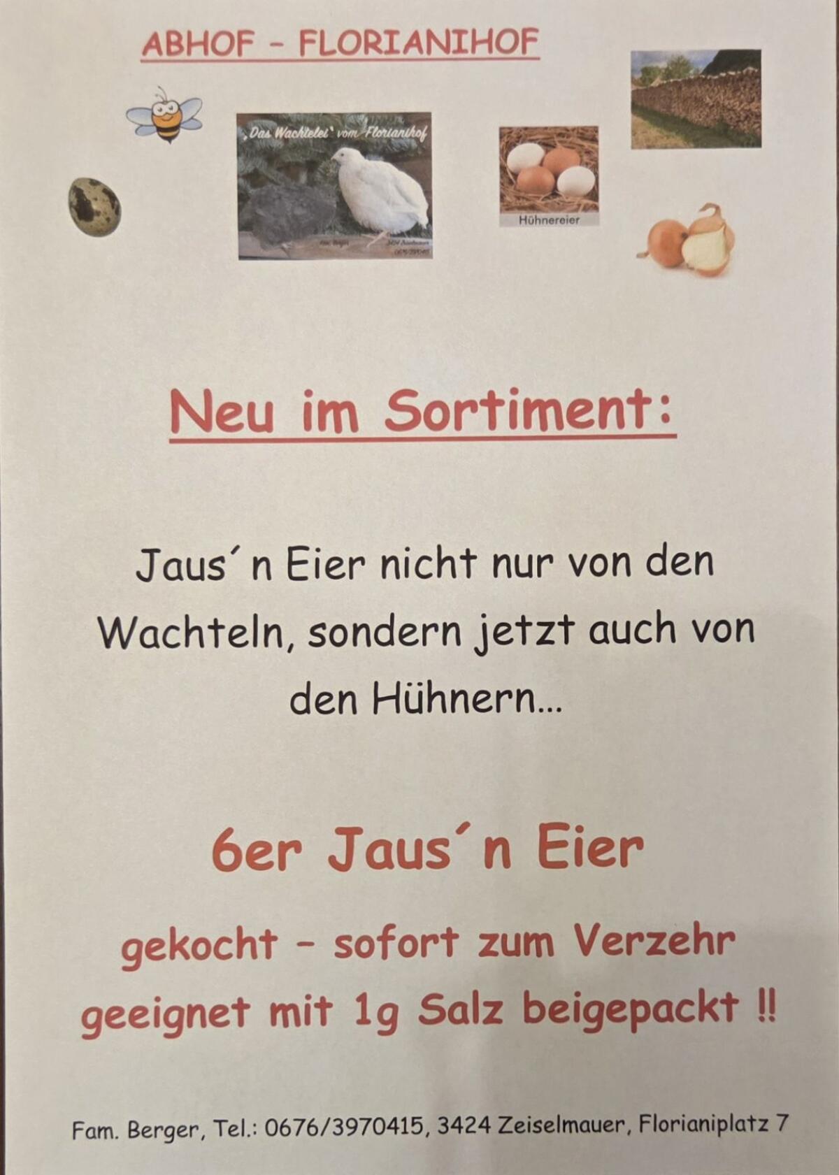 Wachteleier 12er Packung, gekocht oder roh, Hühnereier 6er oder 10er, 30er, eingelegte Wachteleier (Chili, Knoblauch, Balsamico, Curry, Kräuter...), Mehlspeisen, Wachteleierlikör, Hühnereierlikör, Honig- bzw. Imkereiprodukte, Brennholz Eiche und/oder Buche. Alle Tiere (Wachteln und Hühner) werden biologisch gefüttert. Hühner freilaufend, Wachteln Bodenhaltung - keine Käfighaltung. Unser kleiner Abhofladen ist in 3424 Zeiselmauer, Florianiplatz 7 - direkt auf der Hauptstraße B 14. Untertags immer frei zugänglich, Kassa vor Ort - Kamera überwacht.
