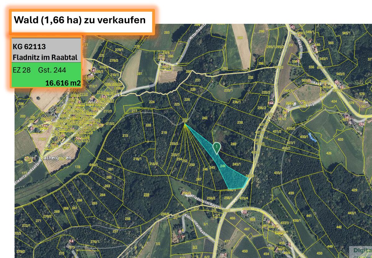 Waldgrundstück in Fladnitz im Raabtal (KG 62113, Gst. Nr. 244) mit 16.616 m² zu verkaufen. Privatverkauf, keine Makler.