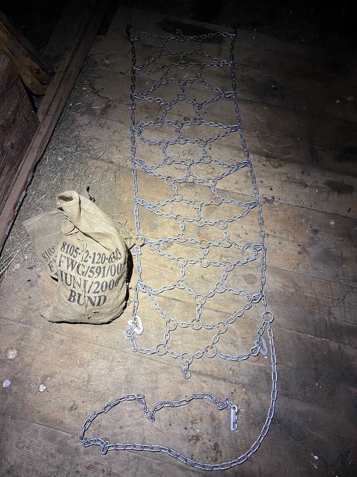 Verkaufe unsere Netzketten, da sie nicht mehr benötigt werden. Länge ca. 260 cm, Breite ca. 60 cm, Gr. 10S laut Internet, letztes Foto der Dimension. Waren früher au