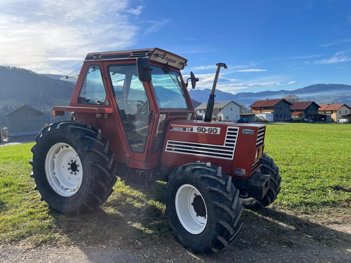Fiat 60-90/DT zu verkaufen. Bj. 1985, 8.663 Bstd., neu vorgeführt, Kotflügel vorne vorhanden, Schneeketten vorne vorhanden, Allrad, 60 PS, Traktor technisch in gutem