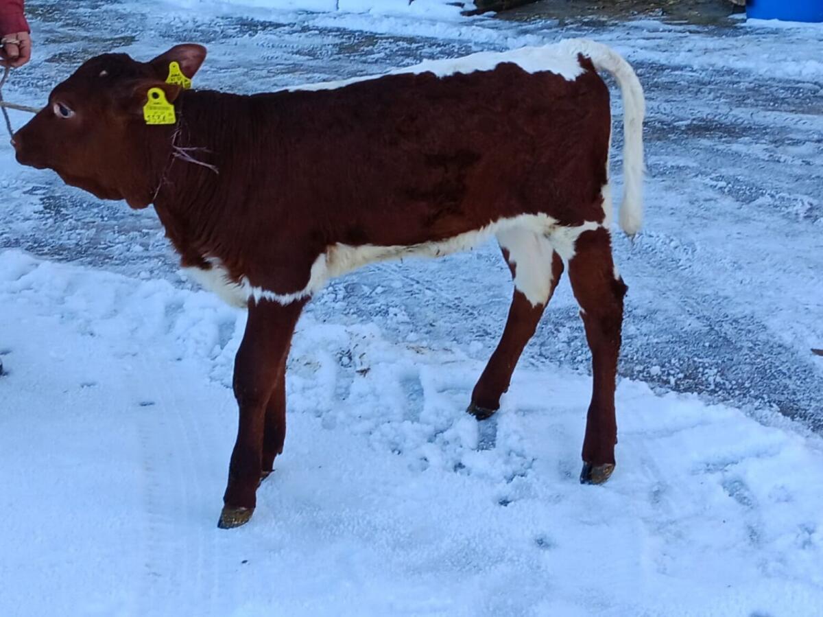 Geb. 12.01.2026, behornt und ad libitum getränkt (11 bis 12 l je Tag). BTV behandelt. Trh s hovädzím dobytkom Pinzgauer