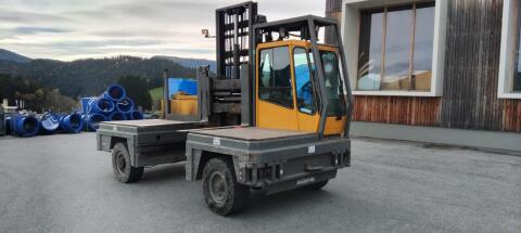 Zum Verkauf steht ein Gebrauchtgerät Baumann Seitenstapler Typ GS50-14-45, 5 t, Bj. 1994 mit 9.300 Bstd. Standard-Hubgerüst mit Hubhöhe 4.500 mm, geschlossene Kabine