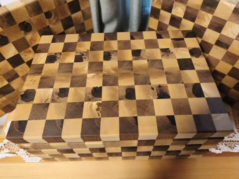 Stirnholzbretter Schachbrettmuster Ahorn und Walnuss 48x33x4 cm, mit Leinöl behandelt, ein Jausenbrett für alle Fälle und Hingucker für jeden Grillmeister. Pflegehin