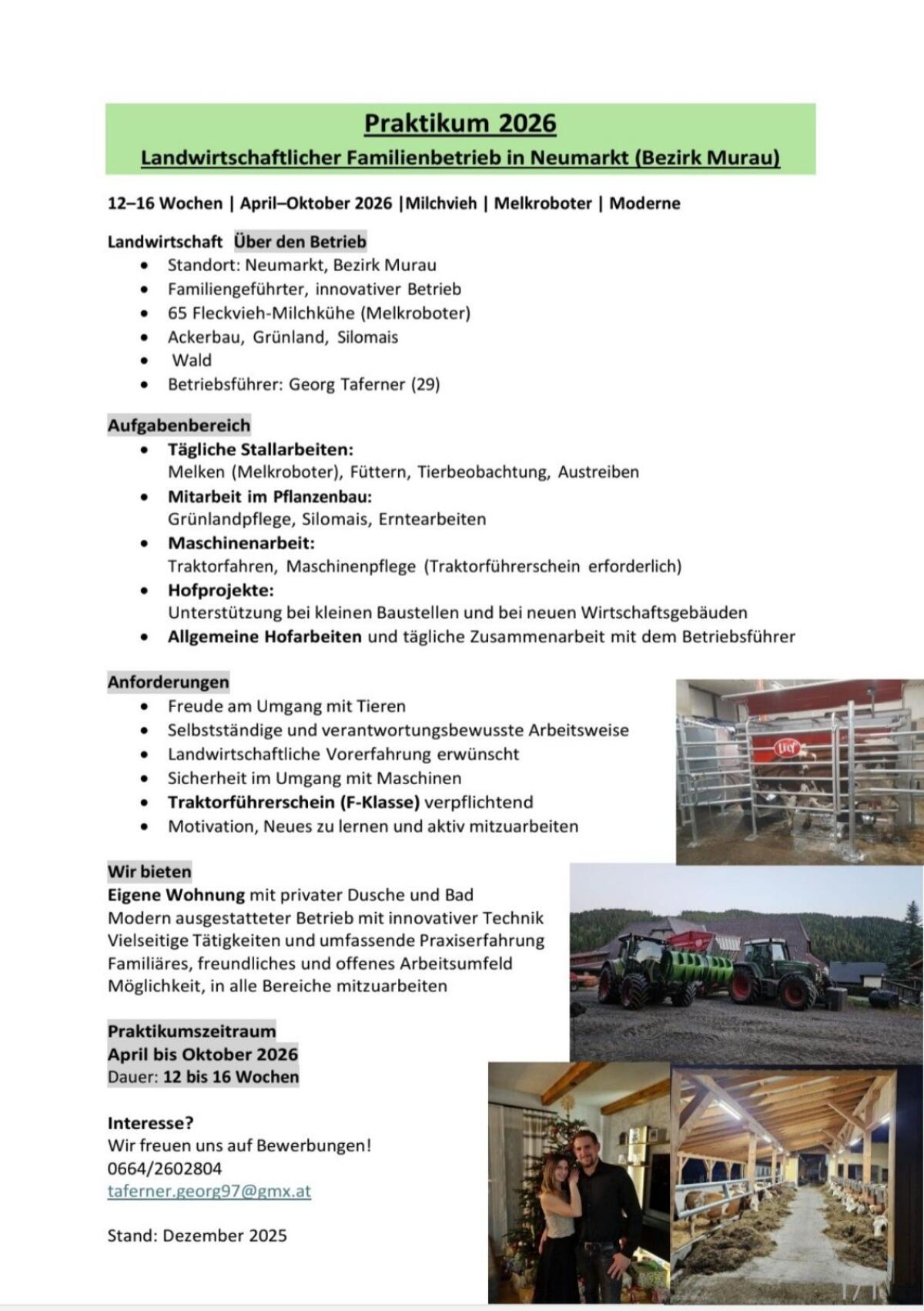 Wir suchen ab Juni bis Oktober 2026 eine/n Praktikant/in. Wir haben 35 Fleckviehmilchkühe mit weiblicher Nachzucht. Wir sind auf 1.050 m Seehöhe im Raum Neumarkt in