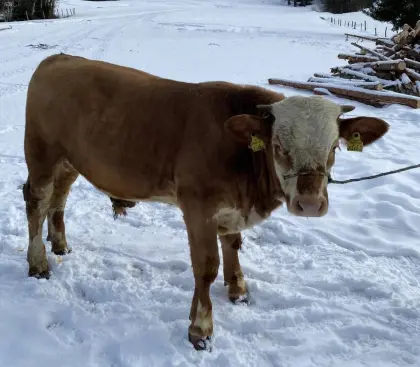 Bio BS Kalbin, aufgrund von Umstellung auf Mutterkuhhaltung abzugeben. Sie ist behornt und mit LIMO belegt. Ihre Mutter wurde ohne Kraftfutter gefüttert. Trh s hoväd