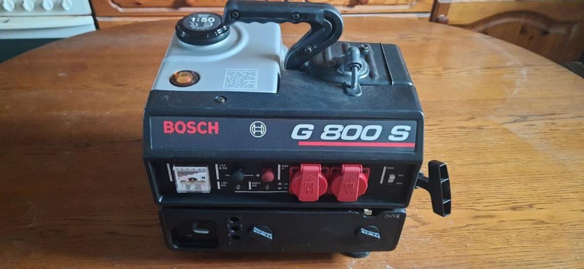 Klein, robust, nicht schwer. Ideal zum Camping oder als Notstromgenerator. Marke Bosch G 800 S. Funktioniert einwandfrei. Springt sofort an. Für einen Generator ziem