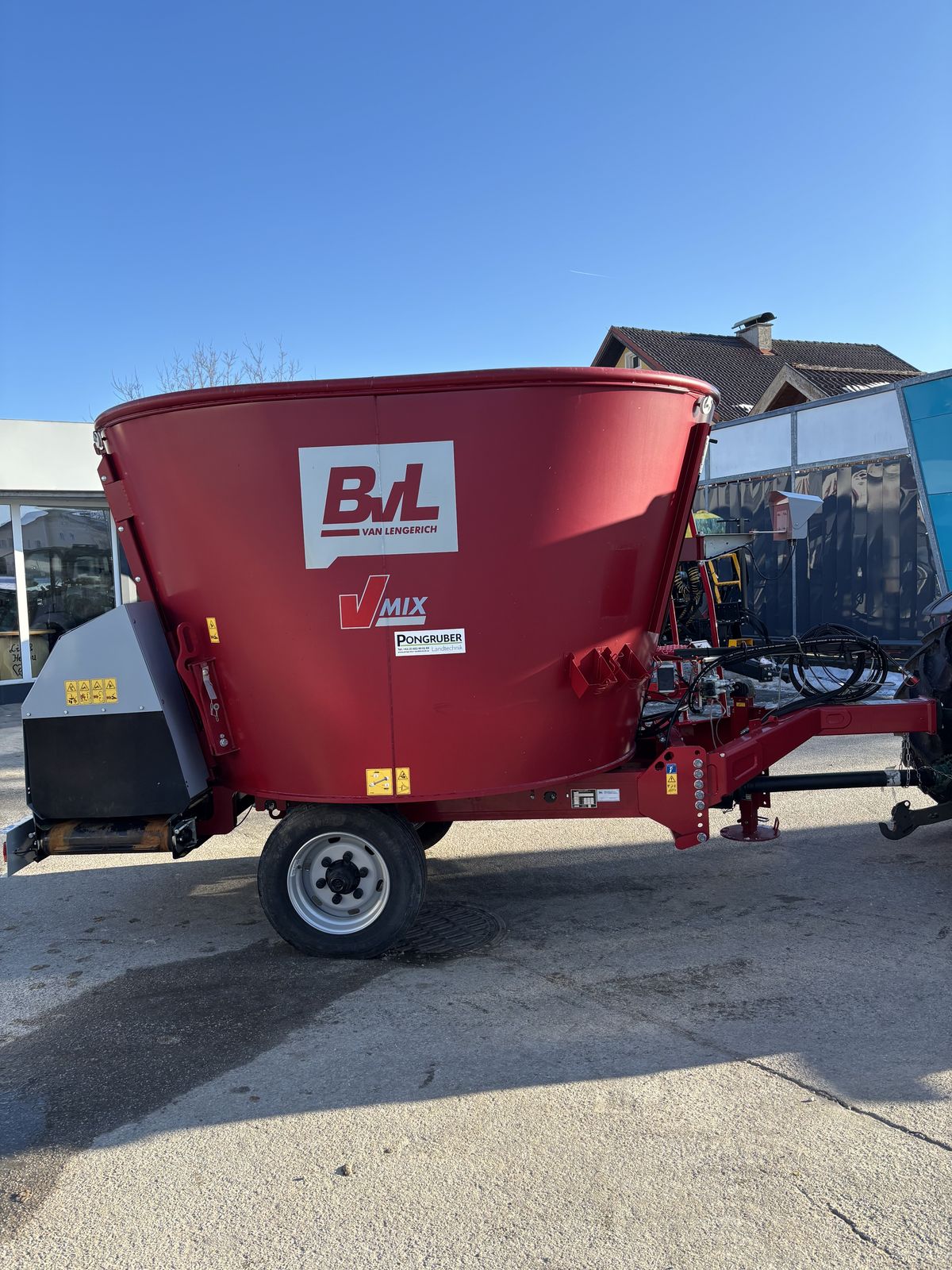 -Vertikaler Futtermischwagen -V-MIX Plus 9-1S -Fremdbefüller -Elektrische Bedienung -Bodenplatte aus 20 mm S355 (St. 52-3) -Behälterwand aus 8 mm S355 (St. 52-3) -Fest verschweißter Überlaufring -Querförderband hinten -Induktionsgehärtete Messer -2 mechanische Gegenmesser vorne und hinten -Wiegeeinrichtung -Weitwinkelgelenkwelle -T-Deichel Obenanhängung -Zugöse 40mm -Einzelachse -Bereifung 215/75R17,5 -Feststellbremse -Hydraulische Hilfsbremse -Mechanischer Stützfuß -Beleuchtung