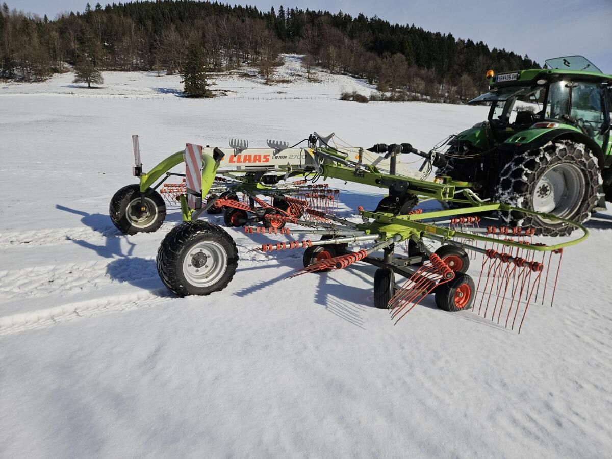 Claas Liner 2700 Mittelschwader in sehr guter Ausstattung Bj. 2014/Ersteinsatz Herbst 2015, hydr. Arbeitsbreitenverst. 6,80-7,40 m, 12 (14) Zinkenarme, je 4 Claas Silagezinken 9,5 mm, Kreiseldurchmesser 3,20 m, 6-Rad-Kreiselfahrwerk, kardanische Aufhängung. Der Schwader wurde für bessere Hangtauglichkeit optimiert: Kreiselentlastung mechanisch, Hauptfahrwerk 340/55-16 Vredestein Flot. + (Frostschutzgefüllt), Einzelkreiselaushub über 2 separate Traktorsteuergeräte. Wird verkauft wegen Umstieg auf Seitenschwader!
