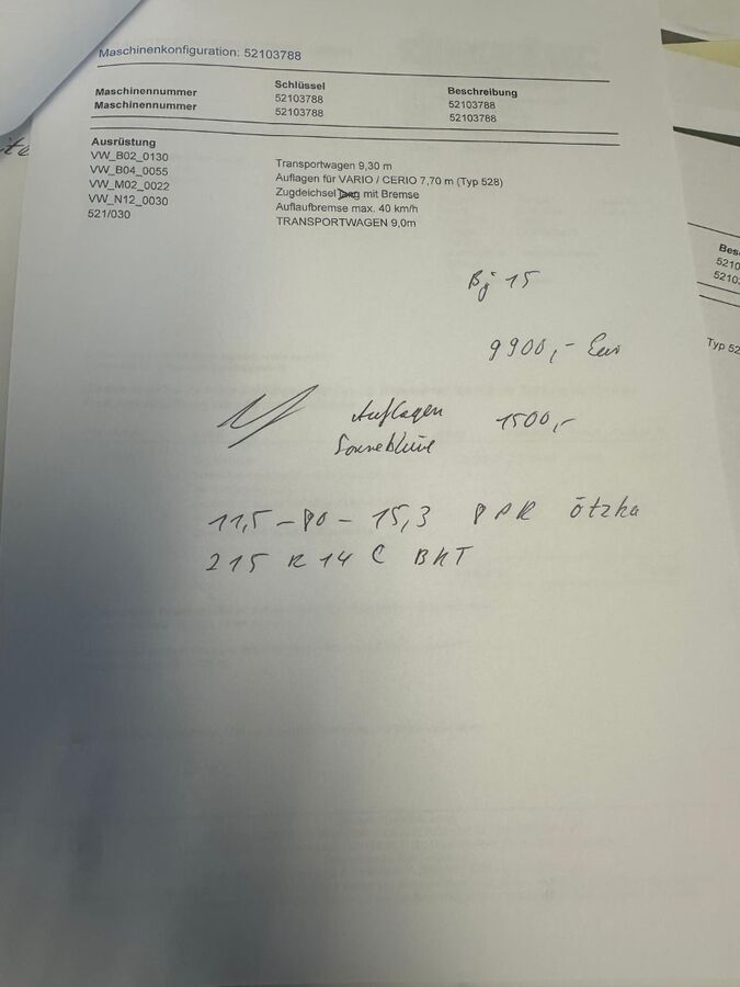Claas Schneidwerkswagen 930 Länge bis 9,3 m (Int-Nr.: 14828) 40 km/H Auflaufbremse Auflagen für Vario und Cerio Bereifung: 11,5-80 R15,3 8 PR Ötzka 70 % 215 R 14 C BKT 80 % Option: Auflage Maispflücker bis 12-reihig 1.690,00 EUR zzgl. MwSt. Es handelt sich hierbei lediglich um eine Anzeige, die zu Informationszwecken dient. Der Kaufvertrag kann nach unseren AGBs mit uns abgeschlossen werden. Gerne kümmern wir uns um Finanzierungsmöglichkeiten im In- und Ausland. Es besteht die Möglichkeit der Inzahlungnahme anderer Maschinen.