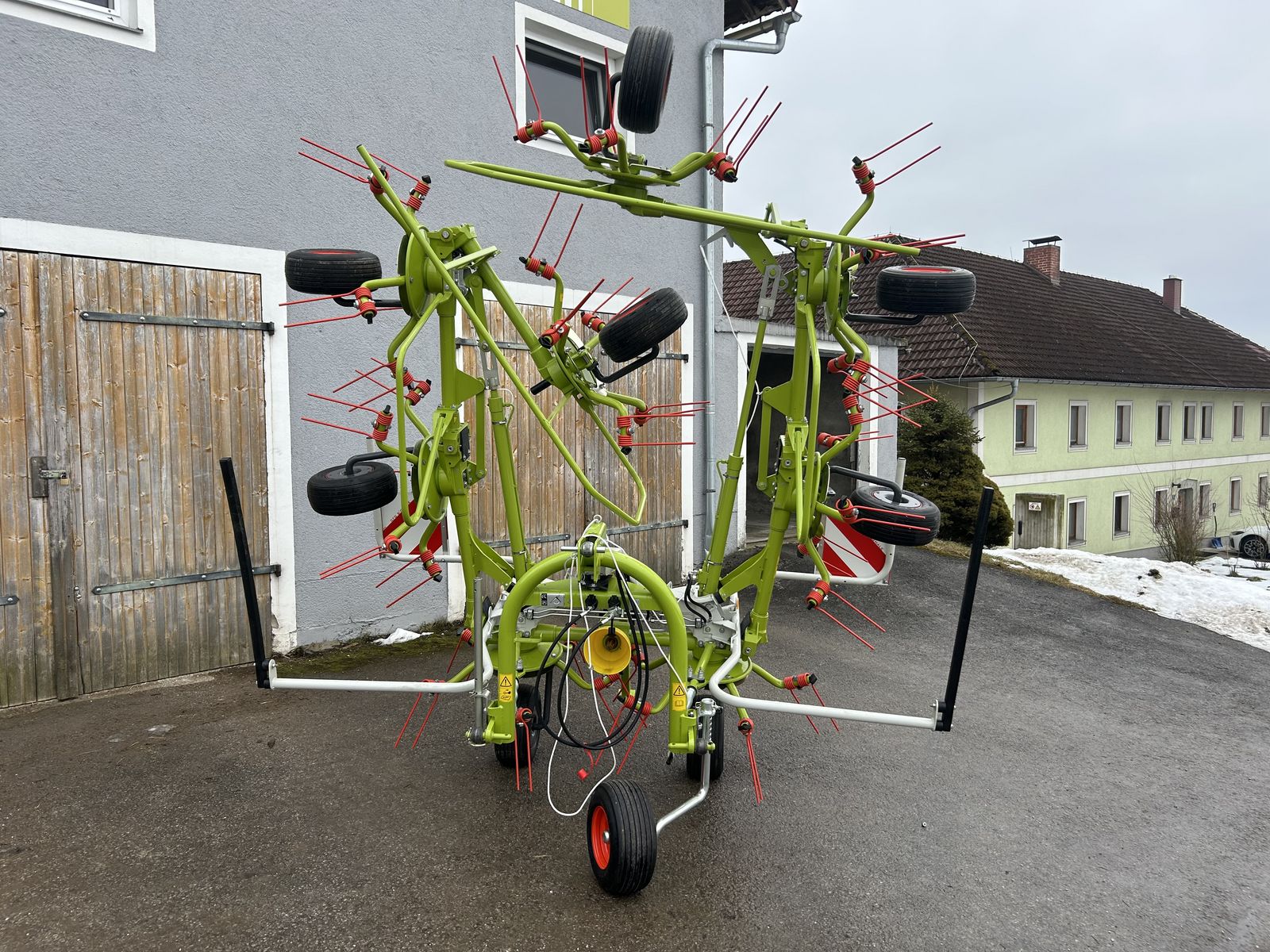 Wender für 3-Punkt-Anhängung, Kat. II Arbeitsbreite 7,70 m Antrieb 540 U/min 8 Kreisel mit je 5 Zinkenträgern Kreiseldurchmesser 1,30 m CLAAS Kraftflusslenker (CKL): Dämpfelemente für ruhiges Nachlaufverhalten, auch bei Kurvenfahrt Direkte Abstützung des gesamten Gewichts in einer Kraftlinie gegen die Unterlenker des Traktors Automatische Zentrierung beim Ausheben am Vorgewende PERMALINK Antriebskonzept: Alle Kreisel beweglich miteinander verbunden Für Klappbewegungen bis zu 180° für kompakte Transportstellung MAX SPREAD Gutflusskonzept: Um 29,3° nach hinten angewinkelte, tangentiale Zinkenanordnung Zinken arbeiten 33% länger nach vorn gerichtet als bei konventioneller Zinkenanordnung Für ca. 10% höhere Arbeitsgeschwindigkeiten als bei konventioneller Zinkenanordnung Gleichmäßige Breitverteilung des Ernteguts Werkzeuglose Streuwinkelverstellung Doppelfederzinken Ø 9,5 mm mit je 5 Windungen Zinken gleichlang und in Super C-Zinkenqualität Zinkennachlauf auf -7°/0°/+7° einstellbar Zinkenverlustsicherung, integriert Kreiselbereifung 8 x 16x6.50-8 Transportbreite 2,93 m Gewicht: ca. 910 kg Hydraulikvoraussetzungen: 1 x dw