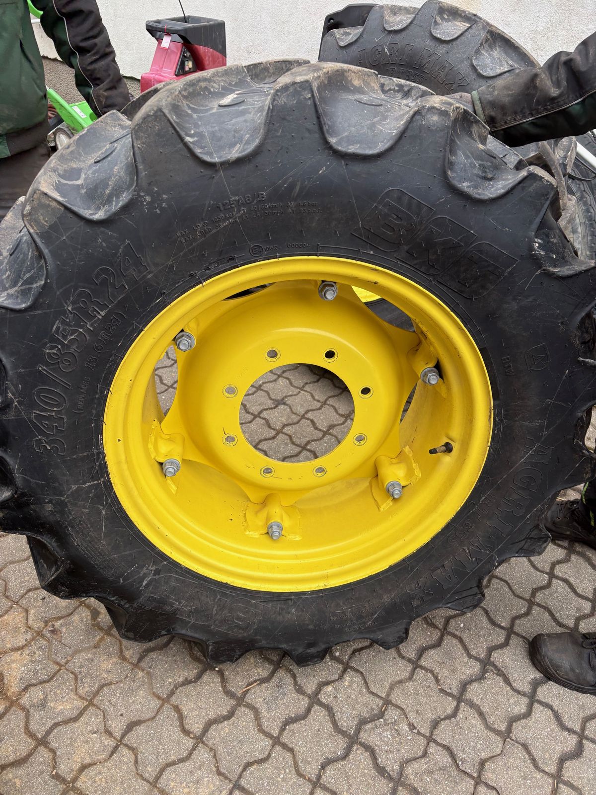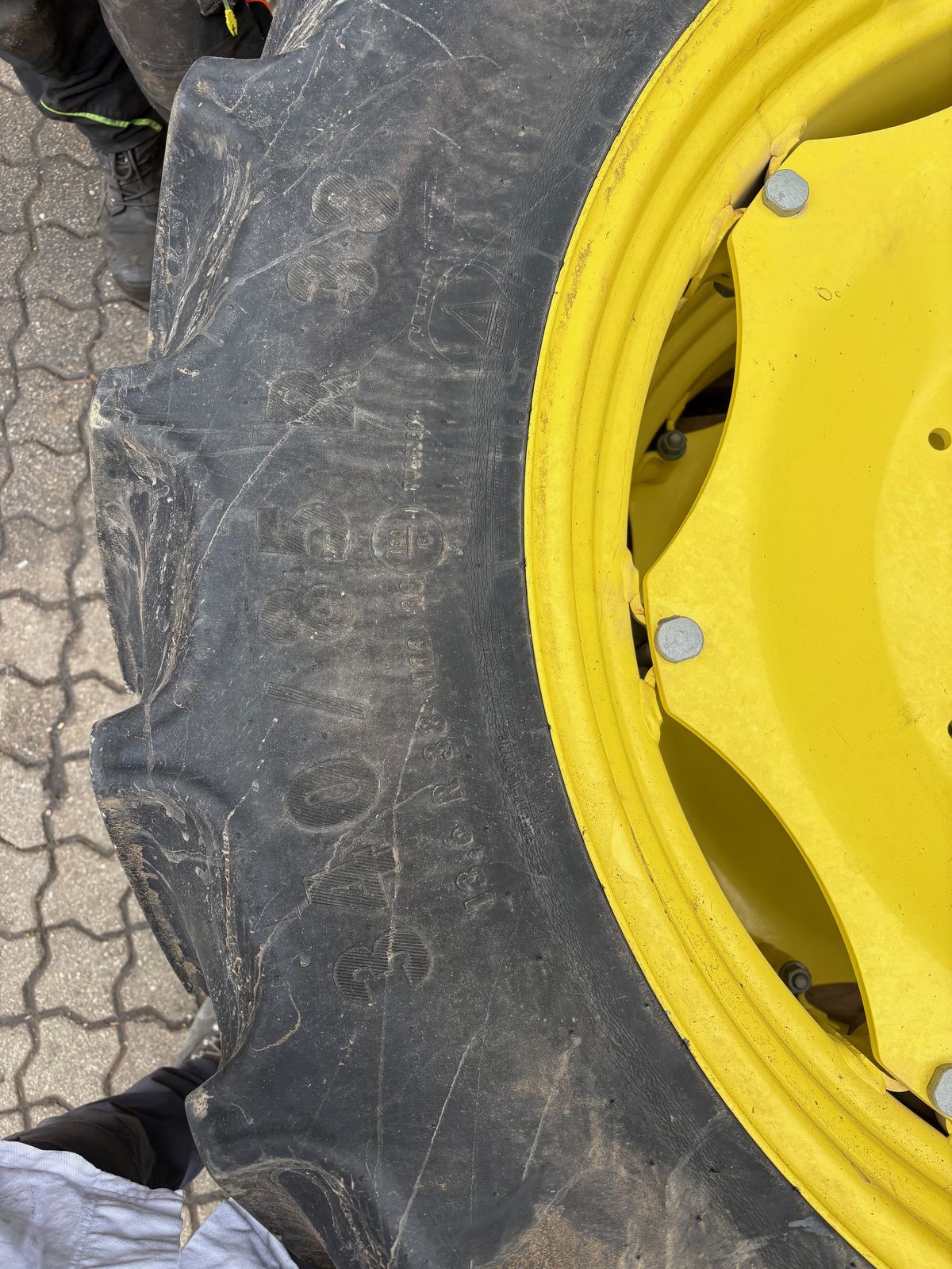 Hinterreifen: 340/85 R38 CONTINENTAL AC85 Profil 60% Vorderreifen: 340/85 R24 BKT Agrimax RT855 Profil 90% Räder waren auf einem John Deere 5080R montiert.