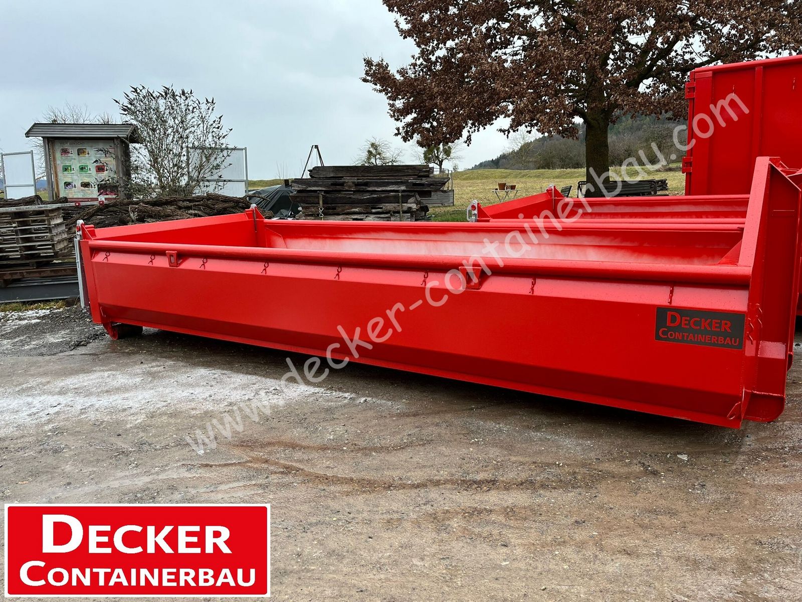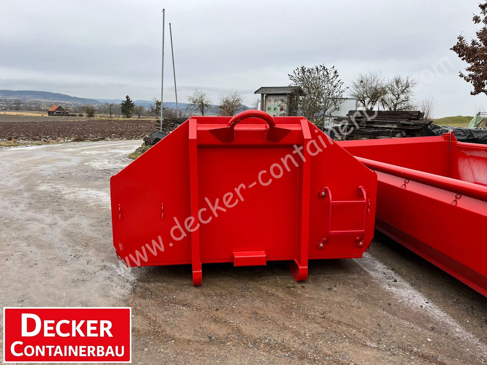Abrollcontainer, Bayernbox, Pendelklappe 11 m³ sofort ab 72108 Rottenburg verfügbar - Zwischenverkauf vorbehalten Innenmaße: L 6000 x B 2350 x H 800 mm Boden 5 mm aus Stahl S235 Unterrahmenkonstruktion Unterrahmen INP 180 UVV geprüft DIN 30722-1 (15.000 kg) C-Verriegelung: Standard Spantenabstand im Boden 625 mm Spantenbreite 110 mm Außenrollen abschmier- u. wechselbar Wand 4 mm aus Stahl S235 Seitenwände gekantet Umlaufender Rundrohr-Rahmen 89/6 mm voll verschweißt Rundumlaufende Plan- u. Netzhaken Stirnwand Hakenhöhe 1570 mm Stirnseitig schraubbare Leiter RAL 3002 Karminrot Sonderausstattung Verstärkter Aufnahmebügel 60 mm 4 x Zurrösen á 2,5 to drehbar, versenkt TÜV geprüft, Made in Österreich Heck Massive Pendelklappe aus Stahl S235 überfahrbar mit 4-fach-Lagerung Federentlastung für leichtgängige Handhabung Lagerdrehpunkt 120 mm höher gesetzt Durchlassöffnung + 200 mm Straßenverriegelung mit Übertotpunktspanner Lackierung Innen und außen grundiert Außen zusätzlich Kunstharzlack in RAL 3000 Feuerrot Geprüft nach DGUV 214-017 passend für Anhänger von Pronar, Krampe, Fliegl ab Lager 72108 Rottenburg verfügbar -Zwischenverkauf vorbehalten- Zahlungskonditionen: 100% vor Verladung. Die Ware bleibt bis zur vollständigen Zahlung unser Eigentum. Es gelten unsere Allgemeinen Geschäftsbedingungen. Angebot ist freibleibend ohne Gewähr und Garantie. Sehr gerne erstellen wir Ihnen ein unverbindliches Angebot. Unser komplettes Produktangebot finden Sie auf decker-containerbau.com