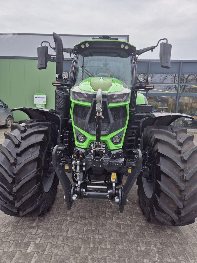 DEUTZ TCD 6.1 L06 4V (STAGE V). 4 Ventile DCR (Deutz Common Rail). 6 Zylinder. 6057 cm³ Hubraum. SCR System (Selective Catalytic Reduction), EGR (External Gas Recirculation) und passiver DPF (Diesel Partikel Filter). 2100 rpm Nenndrehzahl Power bei Nenndrehzahl (ECE R 120): 155 PS/114 kW. Max power (ECE R 120): 161 PS/119 kW. Power bei Nenndrehzahl mit Boost (ECE R 120): 161PS/119 kW. Max power mit Boost (ECE R 120): 171 PS/126 kW. Stufenloses TTV Getriebe, einstellbares Powershuttle. Multifunktionale Armlehne und Joystick für Bedienung von: Motor, Getriebe, Zapfwellen, Hydraulik und Steuerventilen. Hydrostatische Lenkung mit separater Pumpe. Kotflügel hinten mit Betätigung für Hydraulik, Zapfwelle und Steuerventile. elektronische Parksperre (EPB) Zweileitungs Druckluftbremsanlage M.R. Version EU/DE Unterlegkeil Fronttriebachse mit adaptivem Federungssystem, 100% Lamellensperrdifferenzial ASM gesteuert sowie Ölbad-Scheibenbremsen für unabhängige Bremse an allen 4 Rädern. Batterie: 12V-180Ah-800A Bei Joystick für Steuergeräte ohne Umschaltung P1,P2,P3 Vorbereitung für ABS Steckdose Vorbereitung für Bedienung I-Monitor über Touchscreen Bedienpanel für Arbeitsscheinwerfer (WOLP) Auspuff nach oben am A-Pfosten Kraftstofftank: 350 Liter + AdBluetank 29 Liter Tankdeckel ohne Schloss Abgasstufe V Standard Ausführung MaxiVisionPro-Kabine mit elektronischen Hecksteuergeräten Remote-Anschlüsse hinten, mit Abreißfunktion und Ölauffangsystem Drucklose Rücklaufleitung hinten Anhängebock lang Einstellbare automatische Seitenstabilisierung Unterlenker links und rechts Mechanischer Oberlenker mit Fanghaken automatisch Hubstreben beidseitig verstellbar Heckkraftheber mit elektronischer Regelung EHR Externe Bedienung für Heckkraftheber und Zapfwelle am linken und rechten Heckkotflügel und einem DW Hecksteuergerät Beifahrersitz gepolstert mit Sicherheitsgurt Multifunktionsarmlehne rechts verstellbar Automatik-Sicherheitsgurt für Fahrersitz Scheibenwischer/ -waschanlage hinten MaxiVision-Kabine mit MaxCom-Joystick-Steuerung: verstellbare Lenksäule mit integriertem InfoCentrePro, Belüftungs- und Heizsystem, gekühltes und beheiztes Getränkefach, getönte Gläser (seitlich und hinten), Ambientebeleuchtung Armaturenbrett "InfoCenterPro" mit 5" TFT Farbdisplay (km/h) Klimaanlage manuell Rückenverlängerung für Fahrersitz Karosseriefarbe DEUTZ-FAHR grün CTM 4G Communication Telematic Module mit integrierter e-Sim Karte, automatische Einwahl in das lokal beste Netz. Nur in Verbindung mit Connectivity-Paket. Das CTM ermöglicht verschiedene weitere Anwendungen (ggf. kostenpflichtig): RTK NTRIP, Flottenmanagement, Agrirouter. Kennzeichenhalter vorne auf Auspufftopf Heckscheibe ausstellbar, Heckscheibe unten fixiert Schilder "Warnhinweise" Zeichen Geschwindigkeit Heckscheibe Homologation für EEC Markt (Mother Regulation) Bedienungs- und Wartungsanleitung (Deutsch) Elektrische Anlagen Standard Maschine Spezifikation für deutschsprachige Märkte Hinterachse mit Flanschverbindung Powershuttle mit SENSE CLUTCH Felgen vorne und hinten voll verschweißt Kotflügel Verbreiterung Außenbreite 2400 mm Optionen: -Autom. Anhängekupplung D 38 mm, und Kugel Anhängekupplung K80 höhenverstellbar -Anhängesystem Ausführung Sauermann -Sitz Max-Comfort Dynamic XXL Dynamische Luftfederung, elektr. verstellbare Lendenwirbelstütze, Längs- und Querfederung, breiter Rahmen drehbar 8° (links) bis 15° (rechts) -DAB+ High Level Radio mit Freisprechfunktion. Voll integrierte Antenne im Kabinenhimmel. FM/DAB Tuner; Bluetooth, USB und Klinkeneingang. Integration der letzten Anrufe in das InfoCenterPro. -XLarge Vision: Elektrisch verstellbare und beheizte XL-Teleskoprückspiegel mit LED-Beleuchtung -MaxCom-Multifunktionsarmlehne ISOBUS-Expertversion. Mit vollständig integrierter Steuerung aller Traktorfunktionen: Getriebe, Handgas, 2 Motordrehzahlen, Heckkraftheber, Zapfwelle, Hydraulik, ComforTip, Frontkraftheber Positionssteuerung (in Kombination mit FB003/005). Die Armlehne ist mit allen hydr. Bedienelementen ausgestattet (unabhängig von der Hydraulikkonfiguration) somit können alle AUX-N Tasten belegt werden und man kann gleichzeitig die Steuergeräte betätigen. -Bereifung: 540/65R28 vorne, 650/65R38 hinten -Bereifung Marke Trelleborg 38"-42"-46" -Kotflügel vorne verstellbar und schwenkbar mit Fußstütze -Fangschalenhalter Kat.II-III/II -Zusatzhubzylinder (D. 100mm) mit 9700 kg Hubkraft -Unterlenker mit Schnellkupplern und Fanghaken von Walterscheid (Oberlenker mechanisch) -Oberlenker Kat. III für FKH mit automatischem Fanghaken -elektrisches Steuergerät für Frontkraftheber -Frontkraftheber mit doppeltwirkenden Zylindern (Hubkraft 4110 kg) und externer Bedienung -Lizenz für Fleed Management in Ergänzung zu 5 Jahre Data Traffic -Power Beyond Kupplung (bei LS-System) -4 Zusatzsteuergeräte elektro-hydraulische Betätigung, alle mit Mengen- und Zeitregelung -Komfortpaket für Frontkraftheber: Fernbetätigung FKH und 7-polige Steckdose (nicht in Verbindung mit FA192); 1 Steuergerät elektr. mit 2 doppelt wirkenden Anschlüssen vorn. -Load-Sensing Verstellpumpe mit 160 l/min Förderleistung -Heizung für Kraftstofffilter -iMonitor3 in 12" beinhaltet TCSC, GEO, VRC, AUX-N, UT, ISOXML-Datenaustausch -Vorbereitung ISOBUS Gerätesteuerung nach ISO 11783 (Steckdose Heck, Steckdose für Terminal in der Kabine) -Wiederholscheinwerfer über Blink- und Positionsleuchten -4 Arbeitscheinwerfer LED in Motorhaube -10 Arbeitsscheinwerfern LED positioniert am Dach. 4 vorne und 6 hinten. -Dachluke Glas mit UV-Beschichtung -Schmutzabweisende Bodenmatte für Kabine -Schiene auf der Oberseite der Kabine (zwischen rechter A- und B-Säule) zur Befestigung von Fremdgeräten -Antennenhalter auf dem Dach -AGROSKY Performance Steering ready mit "EASY STEER" Funktion zur Einstellung der Lenkübersetzung -Frontscheibe geschlossen, Seitenscheiben links und rechts ausstellbar -Kabine, pneumatisch gefedert, niveaureguliert 