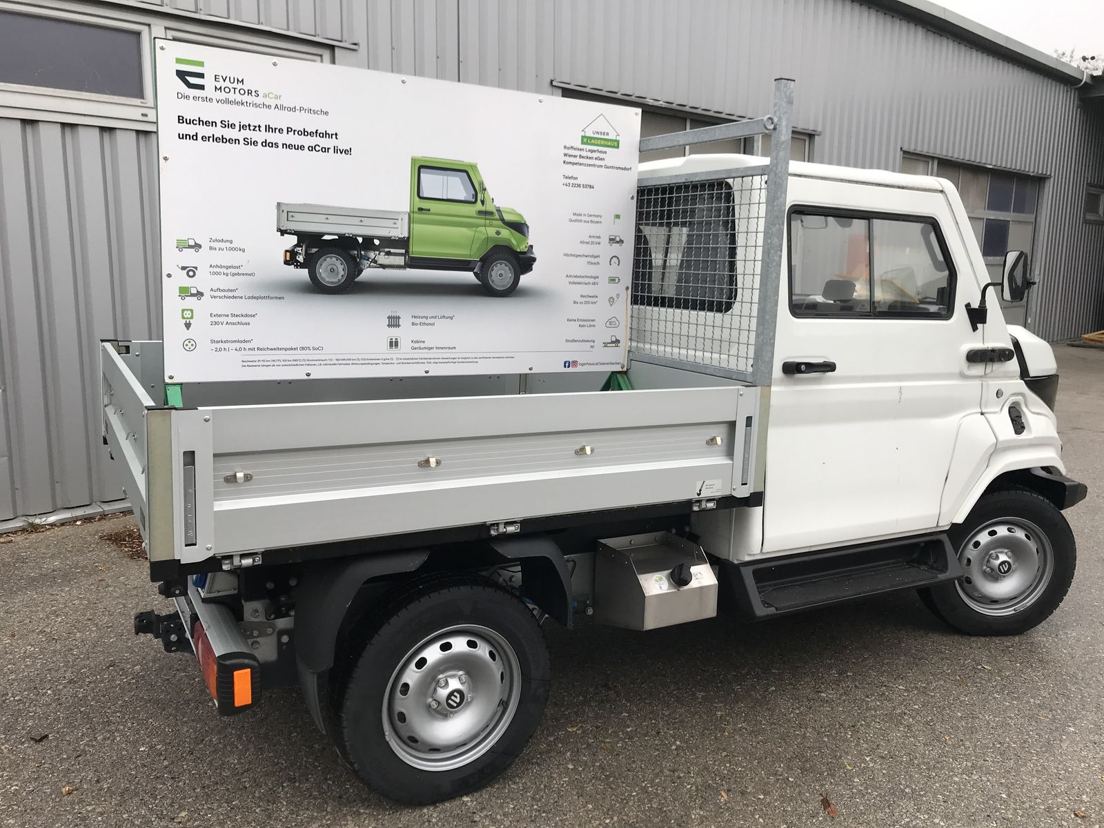 Der EVUM aCar ist ein vielseitiger Lastwagen der Marke EVUM Motors, der sich ideal für verschiedene Einsatzgebiete eignet. Das Modell aus dem Baujahr 2022 zeichnet sich durch seine robuste Bauweise und den effizienten Allradantrieb aus, der für optimale Traktion auf unterschiedlichstem Terrain sorgt. Mit einer Motorleistung von 22 PS bietet der aCar ausreichend Kraft für den täglichen Einsatz.