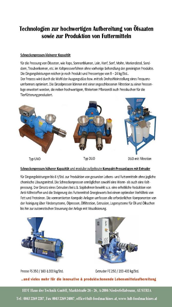 Wir bieten Schneckenpressen kleinerer und mittlerer Kapazität für die Pressung von Ölsaaten, wie Raps, Sonnenblumen, Lein, Hanf, Senf, Mohn, Mariendistel, Sanddorn, Traubenkernen, etc. im Kaltpressverfahren ohne vorherige Behandlung der Produkte. Die Eingangsleistungen reichen je nach Produkt und Pressentype von 8 – 24 kg/Std. Der Prozess wird durch die Wahl der Ausgangsdüse bzw. mittels Drehzahleinstellung eines Frequenzumformers optimiert. Die Einzelpressen können mit einer angeschlossenen Filtration zu einer Pressanlage erweitert werden, die neben hochwertigem, filtriertem Pflanzenöl auch Presskuchen für die Tierfütterung produziert.