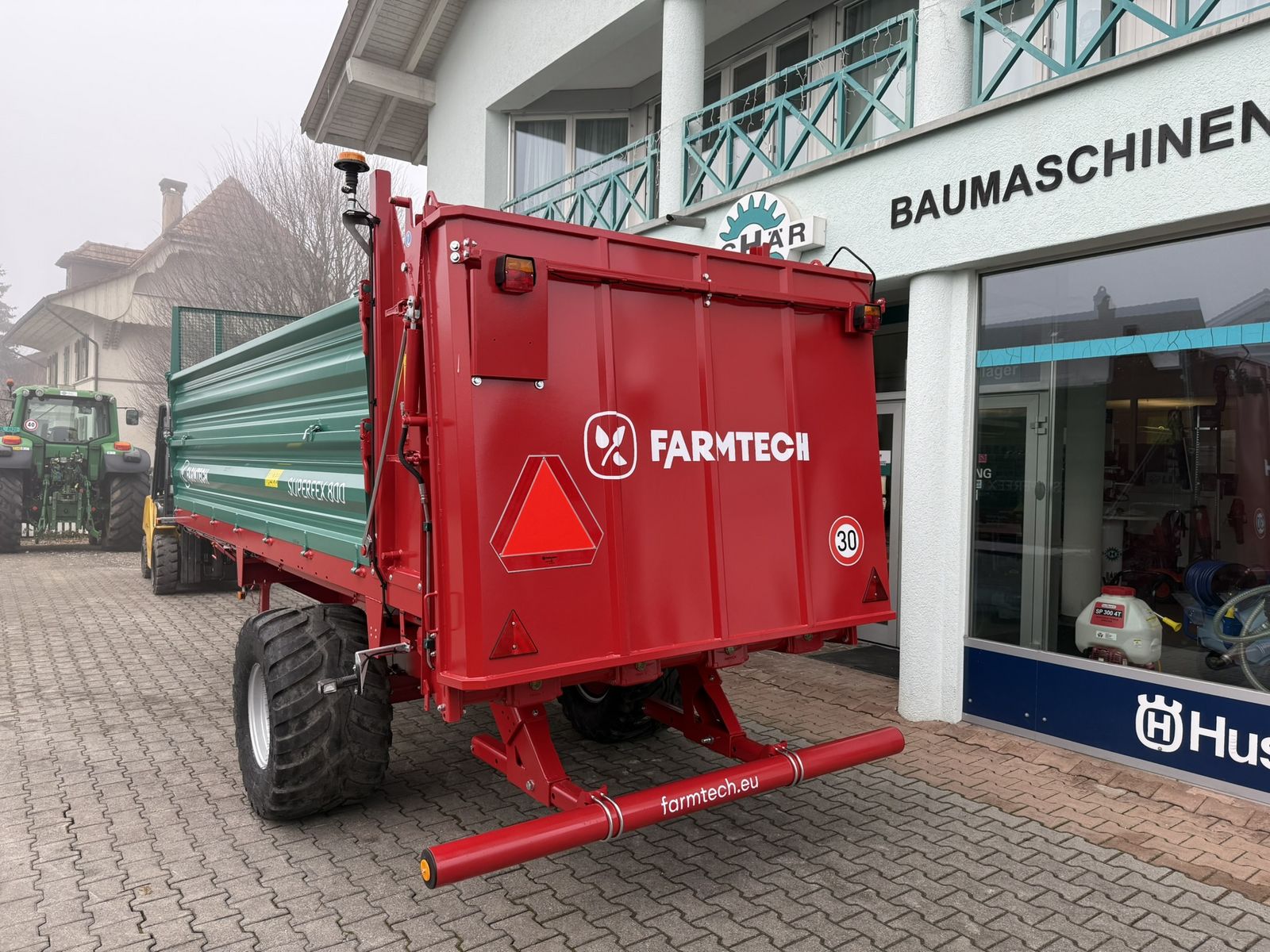 Miststreuer Farmtech Superfex 800 - Zulässiges Gesamtgewicht: 8000 kg - Leergewicht: 2200 kg - Nutzlast: 5800 kg - Stützlast: 1600 kg - Ladevolumen: 9 m3 - Ladefläche: 5.00 x 1.80 m - Bereifung: 520/50-17´´ Vredestein Flotation Trac+ - Aufsatzbordwände 500 + 500 mm seitlich - 4 Kratzbodenketten mit automatischer Kettenspannung - Weitwinkelgelenkwelle WALTERSCHEID, Nockenschaltkupplung - Streuwerk mit 4 stehenden Walzen und HARDOX-Fräsmesser, Hervorragendes Streubild - Streuwerkschutz hinten hydraulisch klappbar - Druckluftbremsanlage; elektrische Steuerung für Kratzbodengeschwindigkeit; elektrische Kratzbodensteuerung; auf Wunsch MFK 40 km/h;
