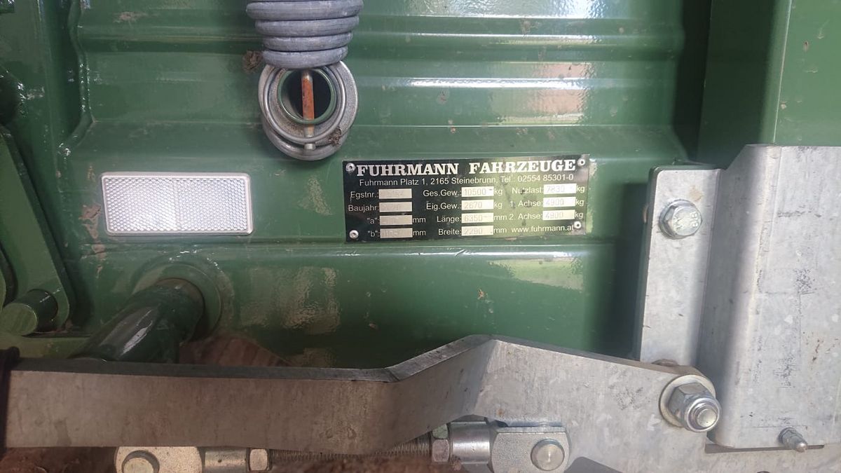 FUHRMANN FF10.500 Alpin 2 - neuwertiger Tamdem-Dreiseitenkipper, Baujahr 2021, Plateaugröße 4550x2220mm, Stahlbordwände 500 + 500mm, Eigengewicht 2800kg, Bordwandhebefedern, Stahlboden 4mm, Kippzylinder mit Hubbegrenzungsventil, Zweileiter-Druckluftanlage, Bereifung: 15/55-17, Sattelstützwinde mit zwei Geschwindigkeiten anstelle von Stützrad, Typenschein - 25 km/h.
