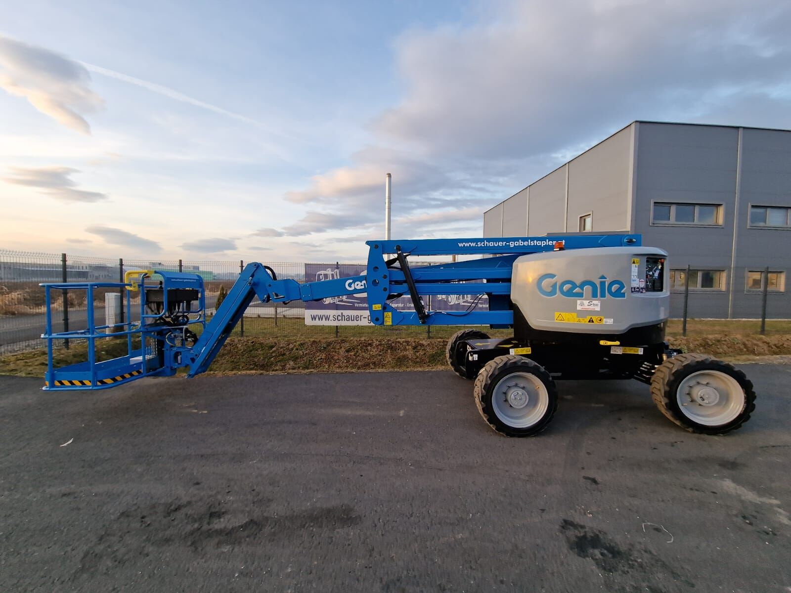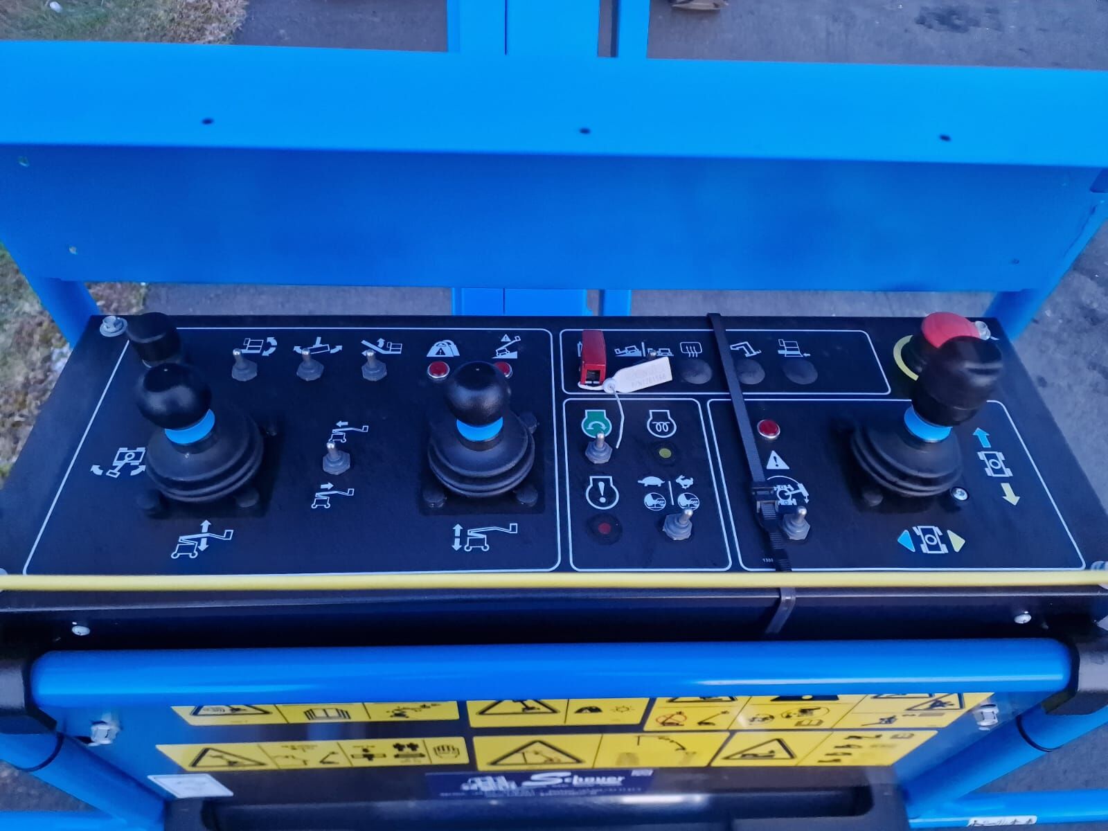 Bauart: Arbeitsbühnen / Gelenkteleskopbühne, Tragkraft: 227kg, Bauhöhe: 2130mm, Batterie: 12V 120Ah , Sonderausstattung: CE Zertifikat, Safety Light, Beschreibung: Plattformhöhe max. 15,59m Seitliche Reichweite max. 9,37m Übergreifende Höhe max. 7,39m A Plattformlänge 0,76m B Plattformbreite 1,83m C Höhe – eingefahren 2,13m D Länge – eingefahren 7,58m E Breite 2,29m F Radstand 2,03m G Bodenfreiheit – Mitte 0,37m Plattform-Schwenkbereich 160° Länge Korbarm 1,52m Vertikaler Korbarm-Schwenkbereich 135° Oberwagen-Schwenkbereich 355° Fahrgeschwindigkeit – eingefahren 8