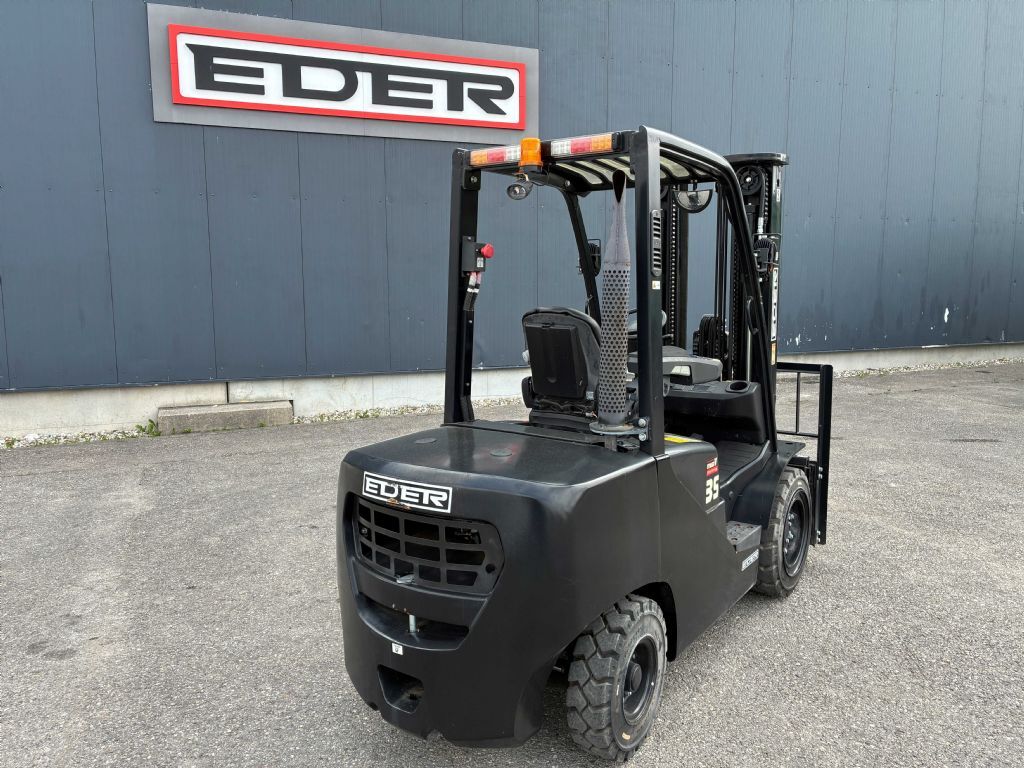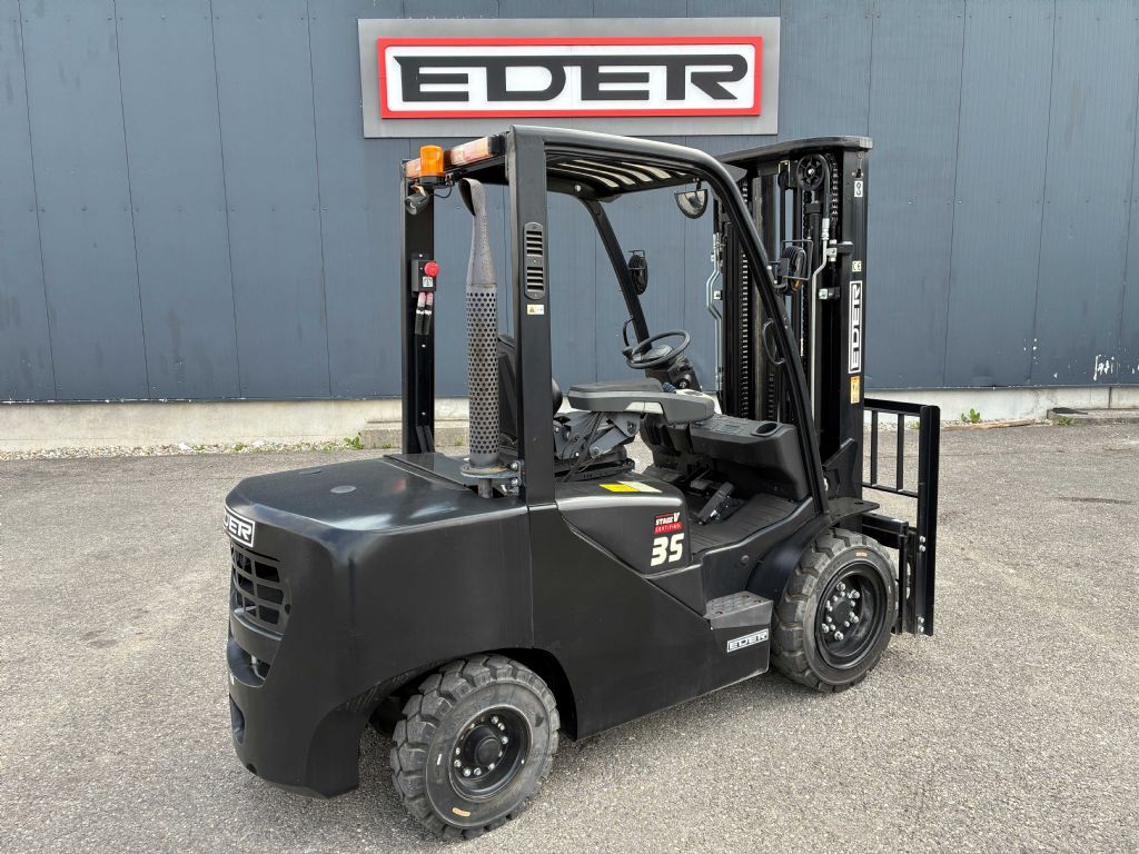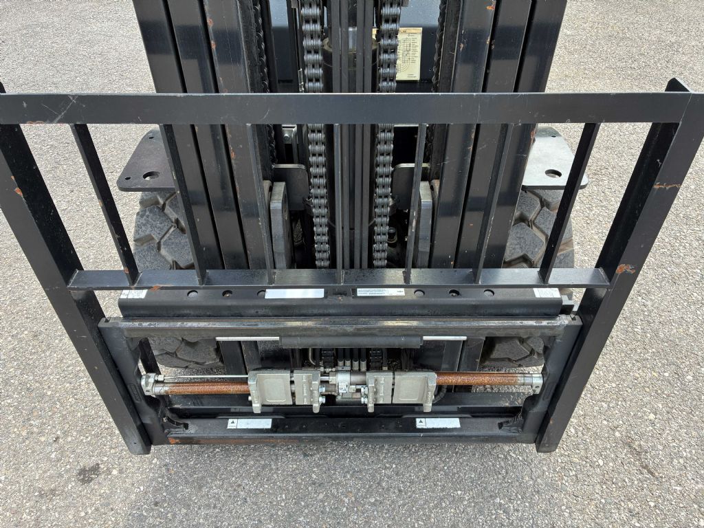 Bauart: Frontstapler / Dieselstapler, Tragkraft: 3500kg, Hubhöhe: 4680mm, Bauhöhe: 2315mm, Freihub: 1485mm, Bereifung vorne: Superelastik , Bereifung hinten: Superelastik , Beschreibung: Fahrerschutzdach, 3. und 4. Hydraulikfunktion mit Schlauchführung, Dachscheibe, vollgefederter Sitz mit Armlehne, Fingertippsteuerung, LED Beleuchtung mit zusätzlichem Blue-Light nach hinten, Zinkenverstellung mit Seitenschub Zustand Gerät KAT 1: Gewartet und geprüft nach Herstellerempfehlungen