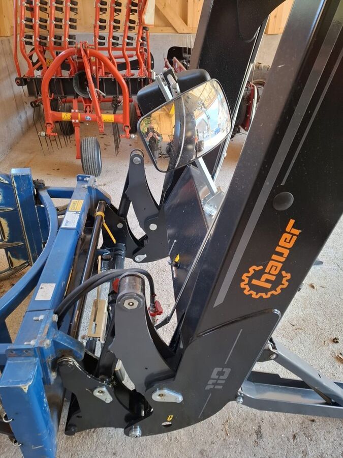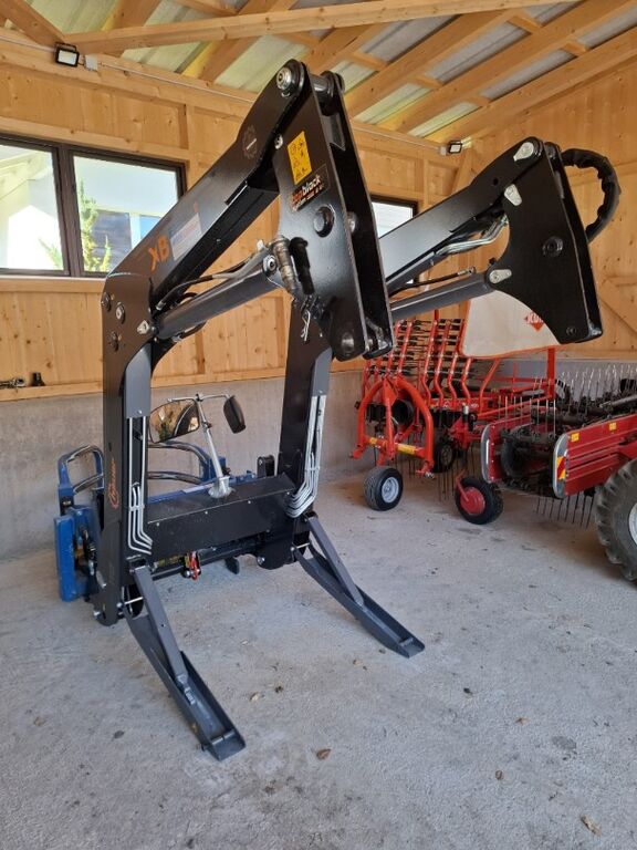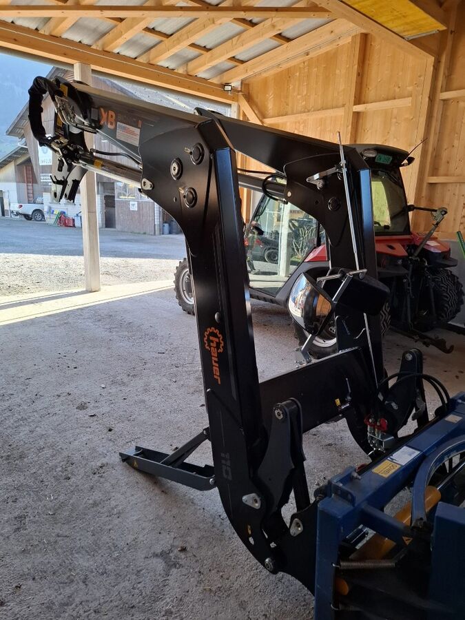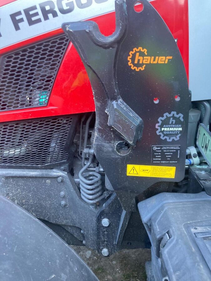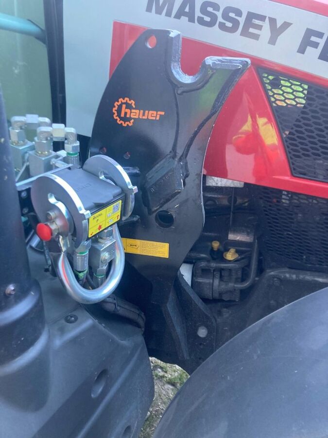 Frontlader mit Parallelführung, Anbaukonsole für Traktor MF5S, Druckbegrenzungsventil, Schraubsatz, Performance-Paket 1, Selektionsventil für 3. hydr. Funktion, Synchro-Lock Kuppler, SMS Stossdämpfer, Spiegelsatz montiert, Lasthaken, Verriegelungsbolzen(ohne Rundballengreifer - Bild), Seriennummer:24500372/1