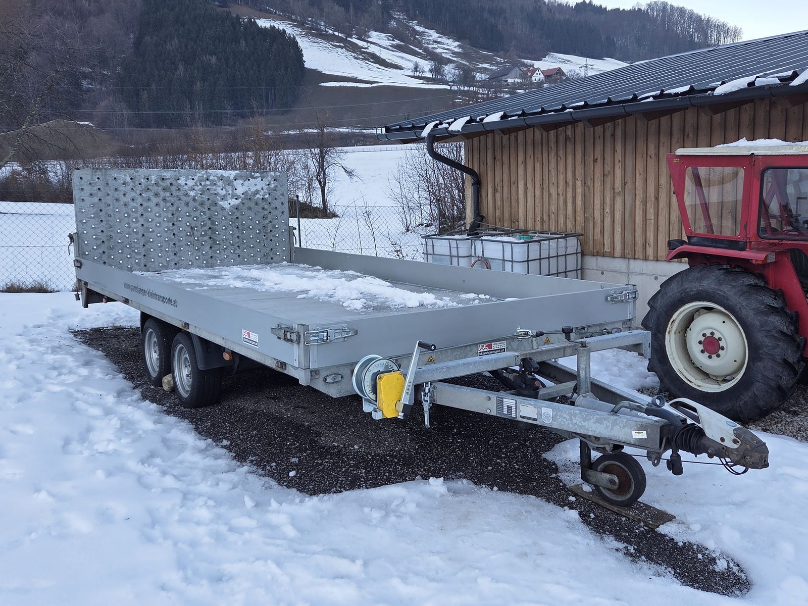 Aufbaumaße innen: 4700 x 2180 x 200 mm Gewicht: 830kg Gesamtgewicht: 3500 kg Nutzlast: 2670 Ladehöhe: 650 mm Serienausstattung * Geschraubtes, feuerverzinktes Fahrgestell * Geschweißte, feuerverzinkte Kippbrücke * Kippbrücke mit doppelwirkender Hydraulik * Bordwände aus Aluminium * Aluboden * 8 Paar Zurrpunkte mit je 400 kg Zurrkraft im Außenrahmen, Dekra geprüft * Überfahrwand ca. 900 mm hoch mit Speziallochprägungen und Gasfedern Zubehör: 2 Stück Auslegestangen für Heckklappe lose Seilwinde 5-fach quer verstellbar Seilwindenbock mit Seilwinde, einsteckbar und in Längsrichtung verstellbar Reifen und Bremsen an beiden Achsen 2025 erneuert. 2 Rückfahrscheinwerfer montiert. Robuster Universaltransporter. Wird wegen zu geringer Nutzung verkauft. Privatverkauf--> keine Garantie oder Gewährleistung.