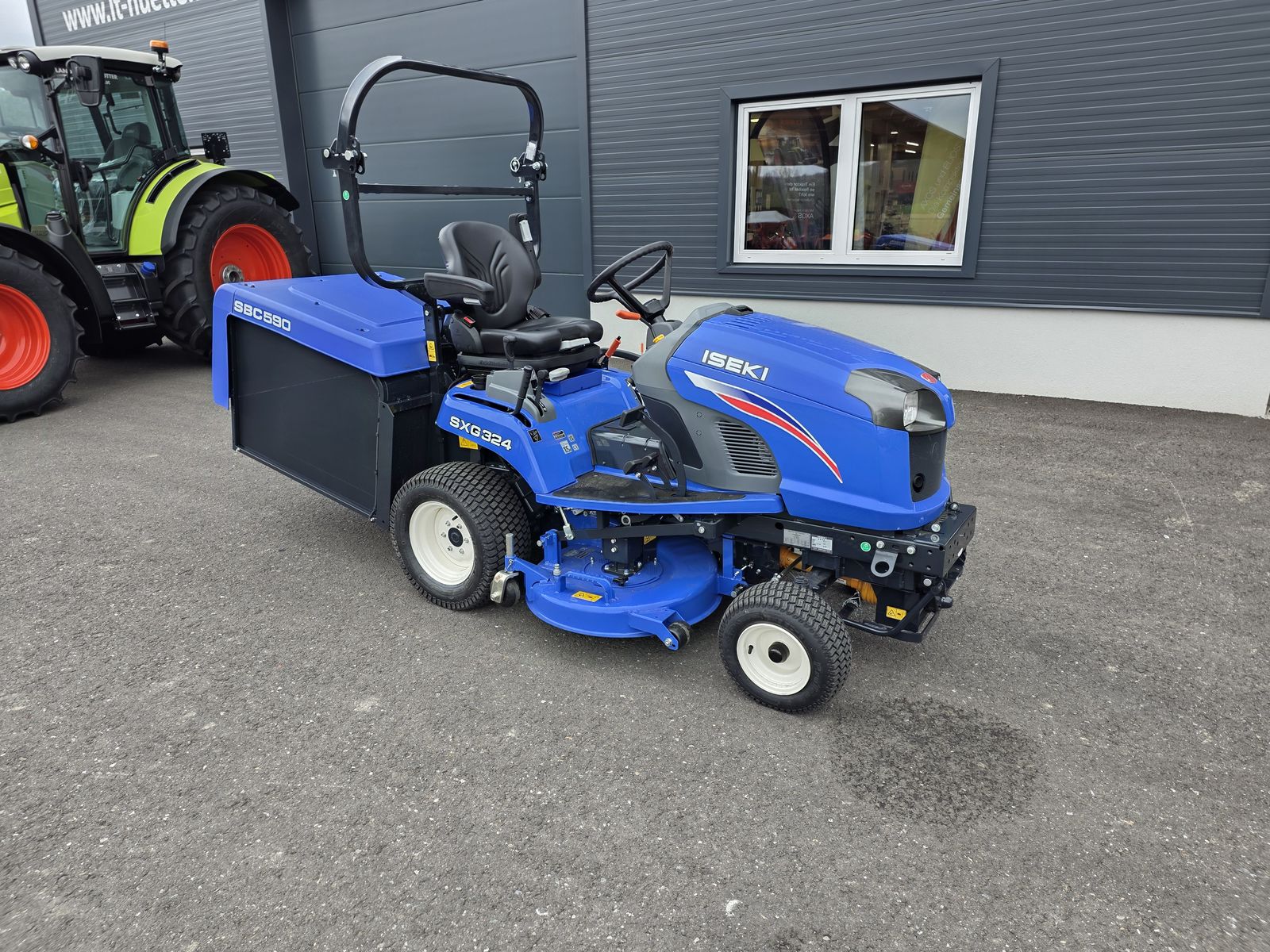 Iseki Mäher SXG 324 mit hydraulischer Hochentleerung 3 Zylinder Iseki Dieselmotor 20 PS Hydrostatgetriebe mit Zweipedalsteuerung, 16 km/h 1,22 m Zwischenachsmähwerk Mähwerksantrieb über Gelenkwelle und Winkelgetriebe Grasfangbehälter 650 Liter mit hydraulischer Hochentleerung hydaulische Lenkung