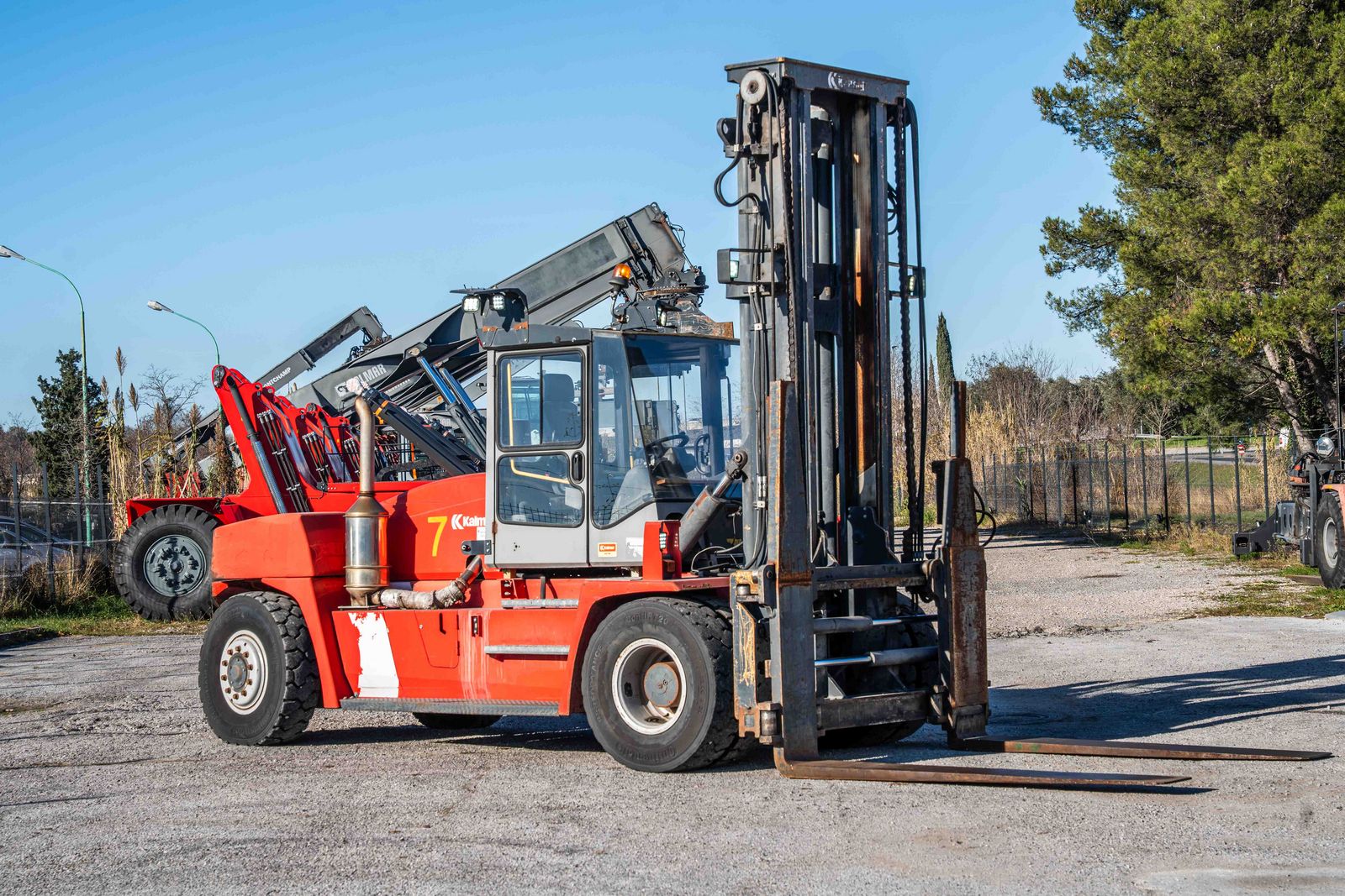 KALMAR-Dieselstapler DCE 160-12 Baujahr: 2011 27600 Betriebsstunden Tragkraft: 16000 kg / 1200 mm LSP Hubmast: Duplex-Freisicht Hubhöhe: 5500 mm Bauhöhe: 4400 mm Gabellänge: 2400 mm Bereifung: Luft Motor: 6-Zyl. Volvo-Diesel - Zinkenverstellgerät mit Seitenschieber - höhenverstellbare Gabel - Kalmar-Komfort-Kabine "Spirit Delta" mit Heizung - STVO-Beleuchtung - LED-Arbeitsscheinwerfer vorne u. hinten GUTER ZUSTAND !!! Für etwaige Rückfragen steht Ihnen Herr Thomas Lehner natürlich gerne zur Verfügung !