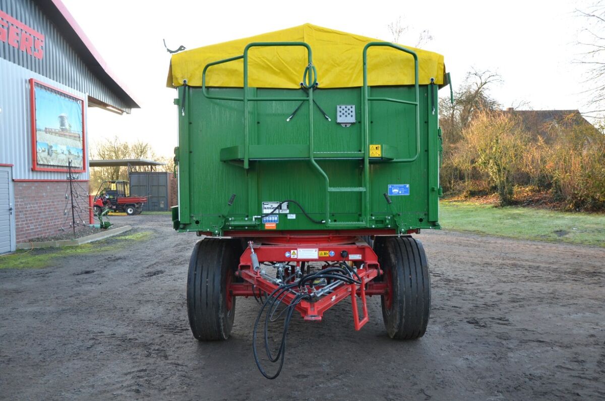 1 Bordwandhöhe 1.500mm anstatt 1.300mm ca. 19m³ Ladevolumen, Multiplexplatten ( beidseitig Phenolharz-film beschichtet, nicht UV-beständig ) 1 durchgehende Untenentriegelungswellen rechts + links mit 2 x Übertotpunktspanner an Stirnwand 1 seitliche Kippbrückenverlängerung 200mm hoch, beidseitig montierbar, rechts montiert 1 hydraulische Bordwandfernentriegelung, beidseitig montierbar mit Anschluss für 2. Fahrzeug, auf der rechten Seite montiert 1 2x zusätzlicher Schieber mit Schütte in Rückwand (3 Stück gesamt) 1 Aufsteckdreiecke vorne und hinten (300mm) OHNE Mitteldreieck mit abklappbarem VERSTÄRKTEM DÜNNWANDIGEM ALU- Spriegelrohr, Durchmesser 70mm, Wandung 4mm + zusätzliche mittlere Querstrebe ca. 300mm von Oberkante Aufbau 1 Querrohre zwischen den Mittelrungen ausgeführt als Trapez 1 Gummilagerung für Spriegelrohr mittig und seitlich 1 Gummilagerung für Anschlagstutzen rechts 1 gelbe Abdeckplane (verstärktes Material), mit Alu-Rollbrett, Handkurbel und seitlich abnehmbaren Anschlagstützen(Seitenbefestigung mit 2x Gurtratsche), auf der rechten Seite 1 Rückwand horizontal geteilt mit Gummiabdichtsystem 1 Seitenbordwände zusätzlich als Portal von der Mitte ausgehend nach außen aufschwenkbar, inkl. einstellbarer Exzenterschrauben, pro Seite, auf der linken Seite 1 automatische Anhängerkupplung inklusive Licht-, Luft- und Hydraulik- anschluss für 2. Anhänger 1 Unterfahrschutz aus Rundrohr mit nach oben versetzter Beleuchtungseinrichtung 1 Kunststoffkotflügel Vorderachse 1 Lichtanlage mit Zwischenkabel und Steckdose am Drehkranz anstatt durchgehender Leitung 1 Seitenmarkierungsleuchten (LED) 1 Positionsleuchten am Heck seitlich montiert mit Zusatzplatte an Kotflügeltragrohr anstatt an Rückleuchten 1 Positions- und Kennzeichenleuchten in LED 1 3-Kammer-Rückleuchten eckig, LED-Ausführung, inkl. Blinkerausfallkontrolle 1 Schutzgitter für Rückleuchten - schraubbar 1 Betätigung Kippwerk 2. Anhänger mit separatem Hydraulikanschluss und Absperrhahn 1 Bereifung "neu" 385/65R22.5 (105km/h) Fabrikat ATHOS HG 2144 1 Sonderlackierung Aufbau und Bordwände nach RAL-Ton Farbe RAL 6002 Laubgrün 1 Gutachten für 40 km/h Zulassung