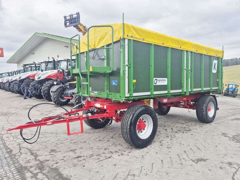 Kröger HKD302 2-Achs-3-Seitenkippanhänger - 18 to zul. Gesamtgewicht, Sonderlackierung Bordwände in 2 Komponentenlack Farbe: schwarzgrün WF19SG, Info: Aluminiumeinfassungen bleiben silber eloxiert, Aufbau, Hutprofile und Rungen bleiben Kröger-Grün, Bereifung: 385/65 R22.5 RE, 18 to Parabelfederung 2-lagig 100 mm breit, Drehschemellenkung mit Kugellenkkranz und typengeprüfter Dreieckzuggabel 1900 mm lang, Höheneinstellung sowie Zuggabelentlastung, Hauptträger Doppel - T, Zweileitungs-Betriebs-Bremsanlage mit automatisch-lastabhängiger Bremskraftregelung (ALB), 4 Membranbremszylinder; Spindelfeststellbremse für Hinterachse, 3-Seiten Kippwerk, hydraulische Mehrkolbenpresse mit kardanischer Aufhängung, 1-Leitungs-System, Kugelkipplager mit Niederhalter hinten; zwei unverwechselbare Steckbolzen, hydr. Hubbegrenzer; Sicherungsseil, 4 mm Stahlblechboden, Kornschieber mittig (480x290mm) mit Hebelbetätigung (links) und abnehmbarer Auslaufschurre, feststehende Eckrungen, Zentraluntenentriegelung, stabiler Unterfahrschutz, Kennzeichenhalterung, Unterlegkeil mit Halter, Kunststoffkotflügel hinten, Bordwandhöhe 1500 mm anstatt 1300mm (= ca. 19 m³ Ladevolumen / Wassermaß), Info: Multiplexplatten (beidseitig Phenolharz-filmbeschichtet, nicht UV-beständig), Aufsteckdreiecke vorne und hinten (300mm) + Mitteldreieck mit abklappbarem Spriegelbaum, gelbe Abdeckplane mit Alu - Rollbrett, Handkurbel und seitlich abnehmbaren Anschlagstützten auf der LINKEN Seite, Mittelrunge komplett abklappbar und herausnehmbar nur einseitig auf der RECHTEN Seite, Seitenbordwände zusätzlich als Portal von der Mitte ausgehend nach außen aufschwenkbar inkl. einstellbarer Exzenterschrauben, auf der RECHTEN Seite. Anhängerkupplung, automatisch inklusive Licht-, Luft- und Hydraulikanschluss für 2. Anhänger, Seitenmarkierungsleuchten (LED) und weiße Positionsleuchten vorne montiert an den Eckrungen, Positions- und Kennzeichenleuchten in LED-Ausführung, 3-Kammer-Rückleuchten eckig, LED-Ausführung, inkl. Blinkerausfallkontrolle und 40 km/h Zulassung gemäß EU-Typengenehmigung mit COC Papieren - Ihr Ansprechpartner - Hr. Christoph Deschberger