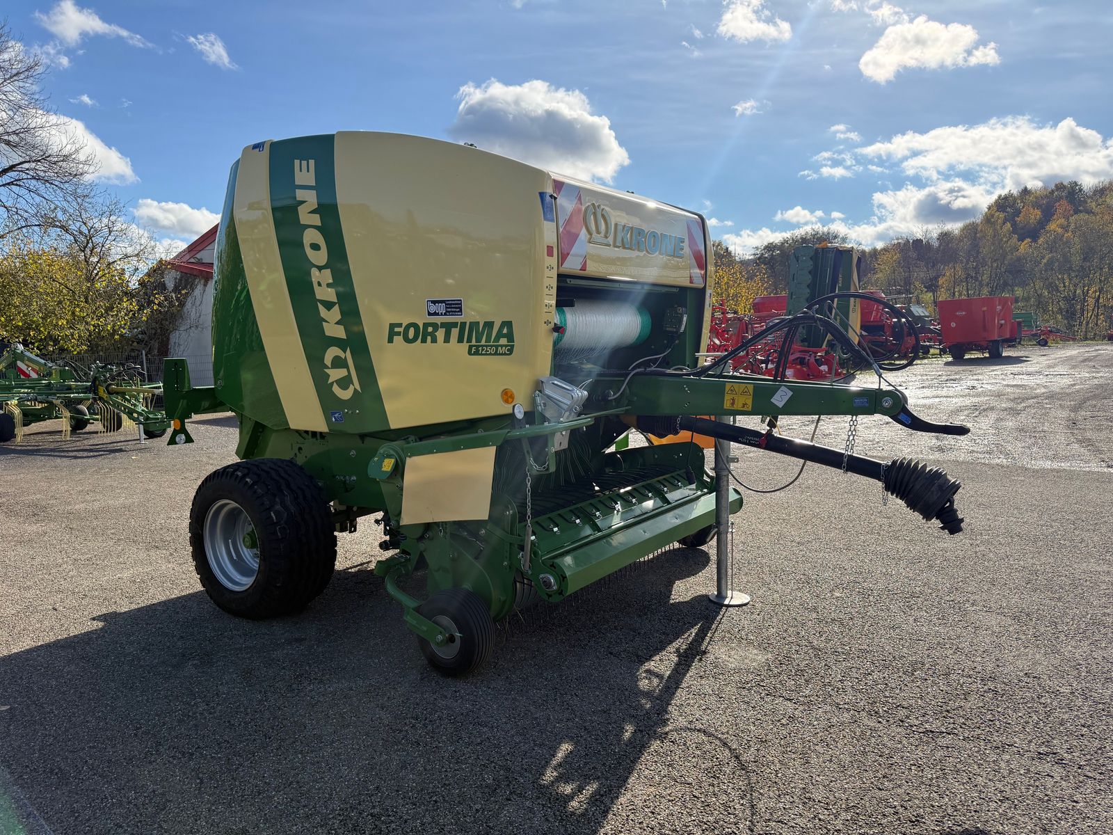 Rundballenpresse Krone Fortima 1250 MC Baujahr 2022 / Ersteinsatz 2024 Ballenzahl 300 Rundballenpresse mit konstanter Ballenkammer und Schneidwerk Länge 4.200 mm, Breite 2.570 mm, Höhe 2.490 mm Spur 2.150 mm Ballen Ø 1.250 mm Zapfwellendrehzahl 540 U/min Erforderliche Hydraulikanschlüsse: 2 x EW Leistungsbedarf ab 36 kW (50 PS) Grundausrüstung: Pick-up: - Rollenniederhalter - Ungesteuerte Pick-up EasyFlow (2.050 mm Aufnahmebreite nach DIN 11220) - Fünf Zinkenreihen, 55 mm Zinkenabstand - Werkzeuglose Höhenverstellung Rotor: - Schneid- und Förderrotor mit 17 Messern (0790) - Messerblocksicherung zum Schutz gegen Fremdkörper - V-förmige Zinkenanordnung für eine kantige Ballenform Presskammer: - Stabkettenelevator mit automatischer Spannvorrichtung - Geringe Antriebsleistung durch einfachen Aufbau und Leichtzügigkeit - Verzahnungseffekt führt zu höchster Drehsicherheit des Ballens auch bei kurzem/nassen Futter - Pressdruckanzeige inkl. links/rechts-Fahrtrichtungsanzeige für gleichmäßige Ballen Bindung: Automatischer Bindestart Weitere Ausstattung: Gelenkwelle, 1 3/8'', Z=6, Überlastkupplung Zusatzausrüstung: - Bereifung 15.0/55-17 - Zentrale Kettenschmierung - Ballenauswerfer