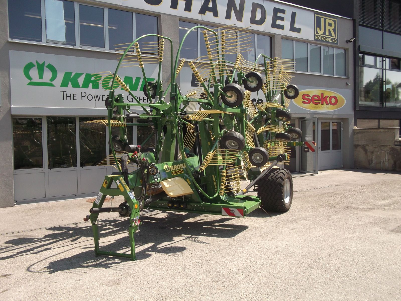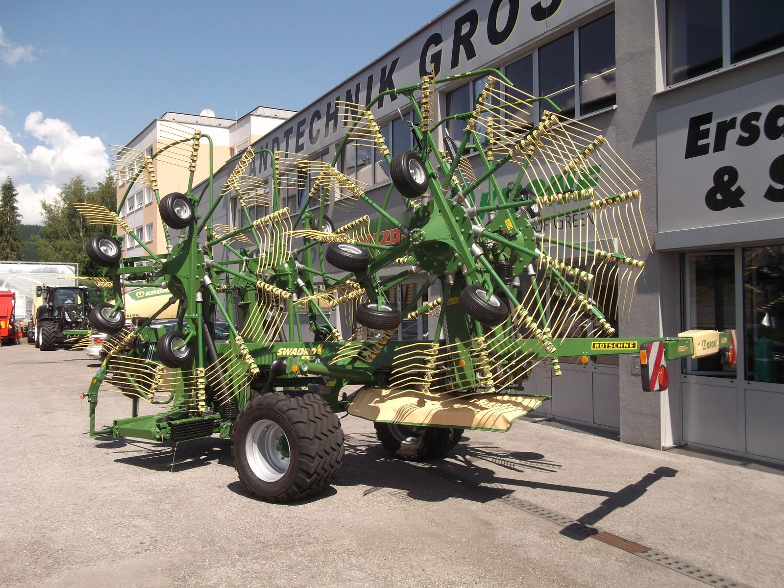 Krone Vierkreisel-Mittelschwader Swadro TC 1250 Arbeitsbreite 9.800 - 12.500 mm Schwadbreite ca. 1.200 - 2.200 mm Druckluftbremse Bereifung 620/40 R22,5 mittleres Schwadtuch paarweise Kreiselaushebung Kreiseldurchmesser: vorne: 3.300mm, hinten: 2.960 mm elf Zinkenarme vorne, 13 Zinkenarme hinten kardanische Kreiselaufhängung Jet-Effekt, Vier-Rad-Kreiselfahrwerk elektrisch-hydrarulische Einkreiselaushebung aller Kreisel am Vorgewende