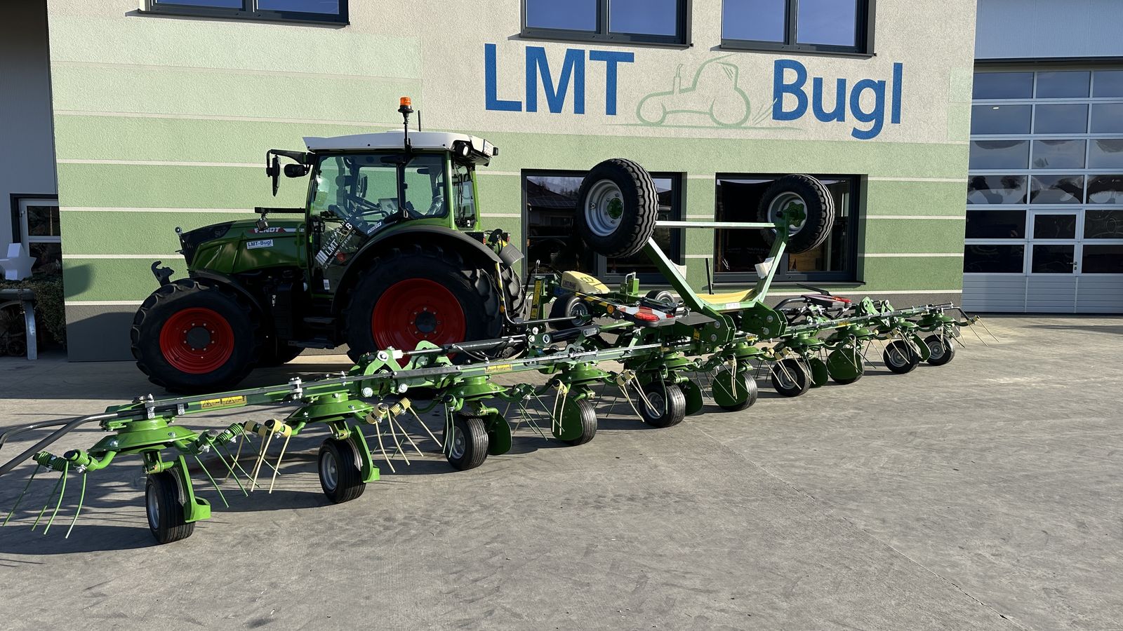 Krone Vendro T1020 Gezogener Kreiselzettwender mit separatem Transportfahrwerk Arbeitsbreite 10.328 mm nach DIN 11220 Transportbreite ca. 2.890 mm Gewicht ca. 1.810 kg Zehn Kreisel Pro Kreisel fünf Zinkenarme Kreiseldurchmesser: 1.376 mm Zapfwellendrehzahl 540 U/min Erforderliche Hydraulikanschlüsse: 2x DW Grenzstreueinrichtung Tastrad Wickelschutz Ersatzräder mit Halterung Leistungsbedarf ab 40 kW (55 PS)