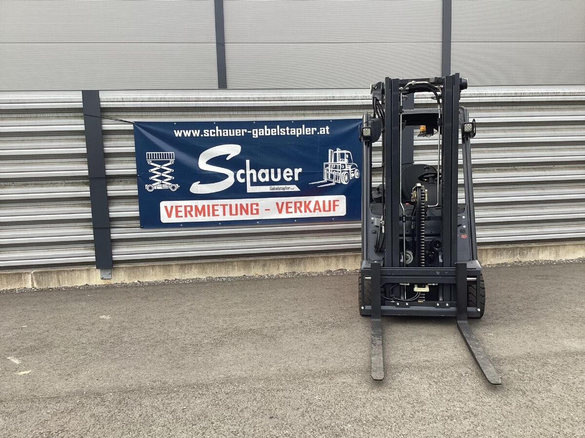 Bauart: Frontstapler / Elektro 3 Rad-Stapler, Tragkraft: 1600kg, Hubhöhe: 4620mm, Bauhöhe: 2110mm, Freihub: 1540mm, Gabellänge: 1200mm, Batterie: Bj. 2016 48V 625Ah , Bereifung vorne: Superelastik Einfach 60 - 80% , Bereifung hinten: Superelastik Einfach 60 - 80% , Anbaugeräte: Seitenschieber, Sonderausstattung: 3. Ventil, Arbeitsscheinwerfer vorn, Safety Light, Sonderausstattungbeschreibung: Rundumleuchte