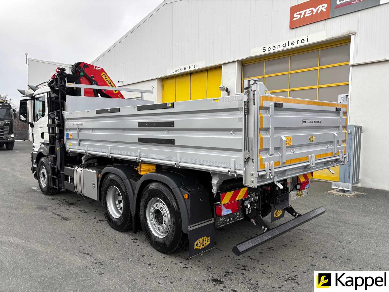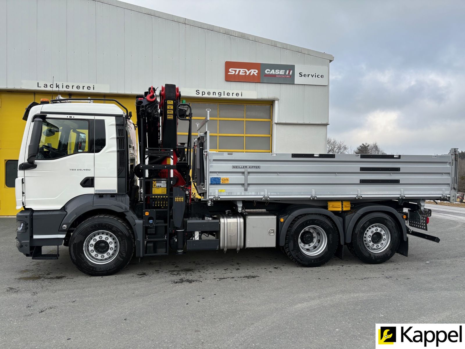 MAN TGS 26.480 6X2-4 BL PALFINGER PK22002EH-D Frontkran MEILLER - Dreiseitenkipper • Neufahrzeug • Automatikgetriebe • ZF-Intarder • 480 PS • NN Fahrerhaus • Antrieb: 6X2 • lenk- und liftbare Nachlaufachse • Differenzialsperre an 2. Achse • Abgasnorm: EURO 6e • Luftgefederte-Fahrerhausfederung • niedrige Bauart • Aluminium-Dieseltank • Bauaufstieg fahrerseitig • Sonnenblende • 2 x Drucklufthörner am Fahrerhausdach • 2 x LED-Rundumkennleuchten am Fahrerhausdach • 2 x LED-Arbeitsscheinwerfer am Fahrerhausdach hinten • 2 x LED-Blitzleuchten in der Frontmaske • 2 x LED-Blitzleuchten am Fahrzeugheck • 2 x LED-Arbeitsscheinwerfer am Fahrzeugheck • Fahrerkomfortsitz • Multifunktionslenkrad • Tempomat • Navigationssystem • Bedienfeld MAN EasyControl, 4 Funktionen bei offener Tür • Klimaautomatik • Kühlschrank • Anhängerkupplung mit Anhängerausrüstung • 2 x Edelstahl-Werkzeugkiste • MAN EasyStart Wegrollsicherung • Breitreifen vorne PALFINGER PK-22002EH-D Frontkran • 5 hydraulische Ausschübe • Funkfernsteuerung • Hochstand mit Ablagepult • 180° hydraulisch hochschwenkbare Stützen • Lasthaken • Unterlegsplatten mit Halterungen Optional: • Zweischalengreifer • Rotator • Rotatorhaken MEILLER-Dreiseitenkipper • Innenmaße: 5.100 x 2.450 x 800 mm • Containerbreite • 2-schalige Stahlbordwand • alle Bordwände klapp- und pendelbar • pneumatische Pendelverschlüsse links und hinten • ausziehbarer Leiterträger in der Stirnwand • ausziehbare Formrohre am Heck zur Ablage der Rückwand • Ecksteher abnehmbar • 5 Paar Zurrösen im Brückenboden versenkt • 4 Stück Zurrösen in der Stirnwand • Netzhaken an den Bordwänden • Kupplungsmaul in der Stirnwand • Alu-Leiter mit Halterung • klappbarer Unterfahrschutz Finanzierung - Leasing / Mietkauf / Miete - möglich!
